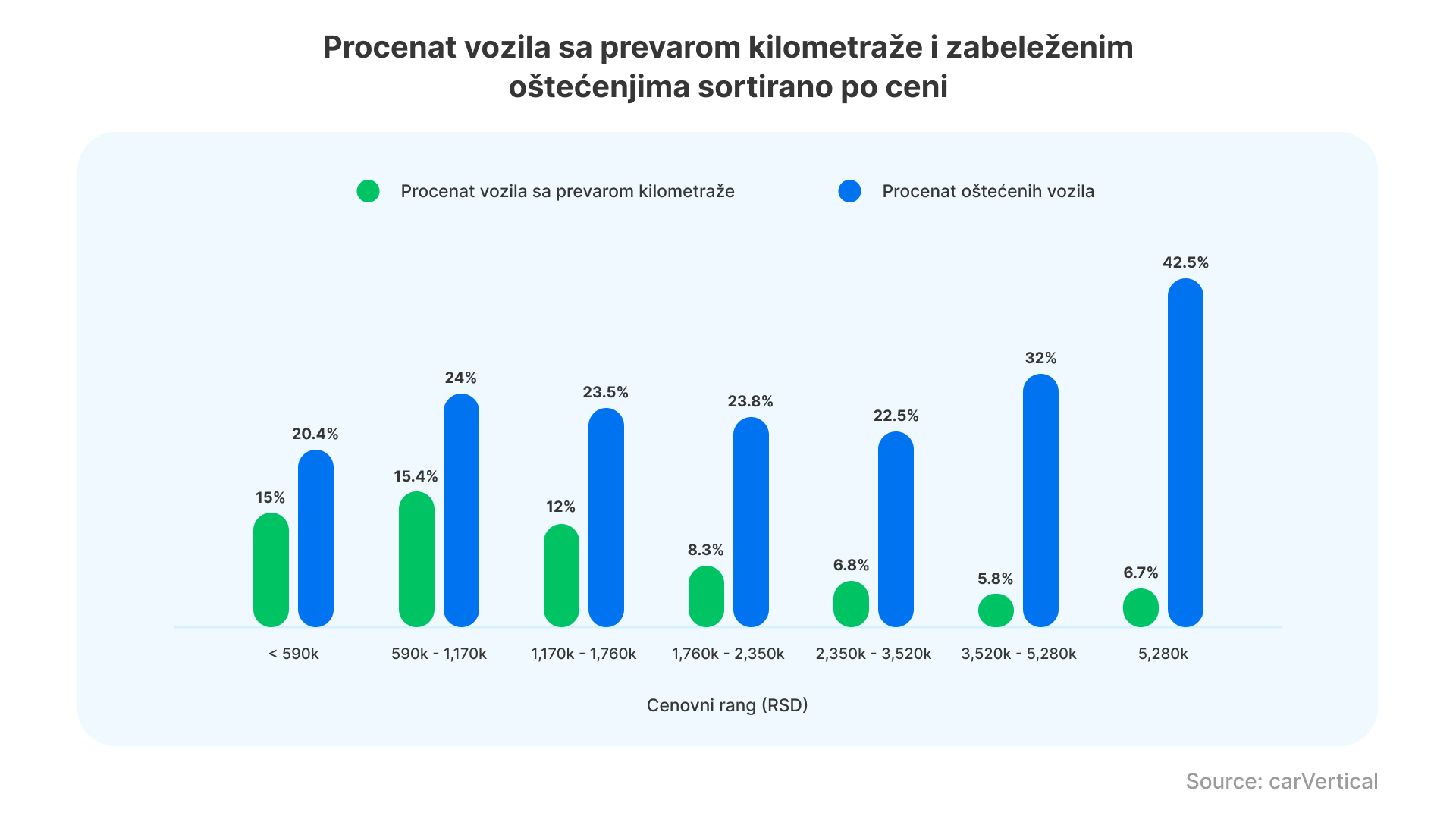 Od svih automobila koji koštaju do 590.000 RSD i koje je proverio carVertical u Srbiji, 15% ima promenjenu kilometražu. Automobil sa izmenjenom kilometražom ne samo da će imati nižu vrednost, već može biti teško planirati njegovo održavanje.