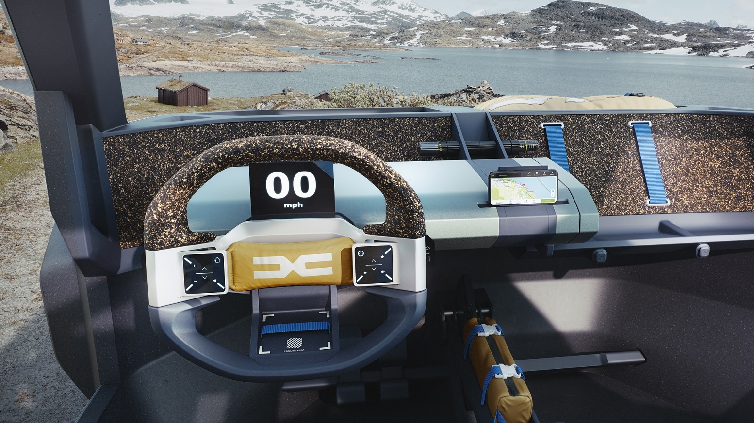 U unutrašnjosti su takođe upotrebljeni prirodni materijali, kao što je obloga kontrolne table od plute. Ukrasni hromirani detalji nisu korišćeni, baš kao ni i u najnovijim Dacijinim modelima.