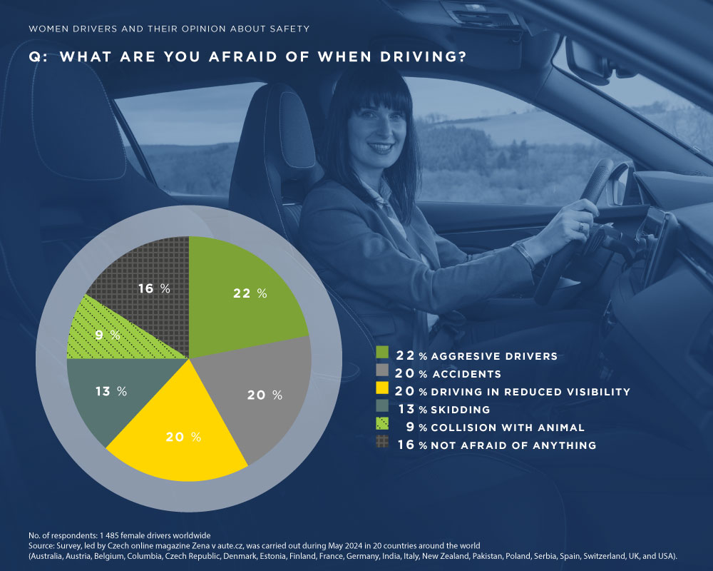 Prema studiji, postoje tri glavne teme oko kojih su žene vozači zabrinute: agresivni vozači (22 %), saobraćajne nezgode (20 %) i vožnja pri smanjenoj vidljivosti (20 %). Zatim slede proklizavanje vozila (13 %) i sudar sa životinjama (9 %). Sa druge strane, 16 % žena vozača ne plaši se ničega.