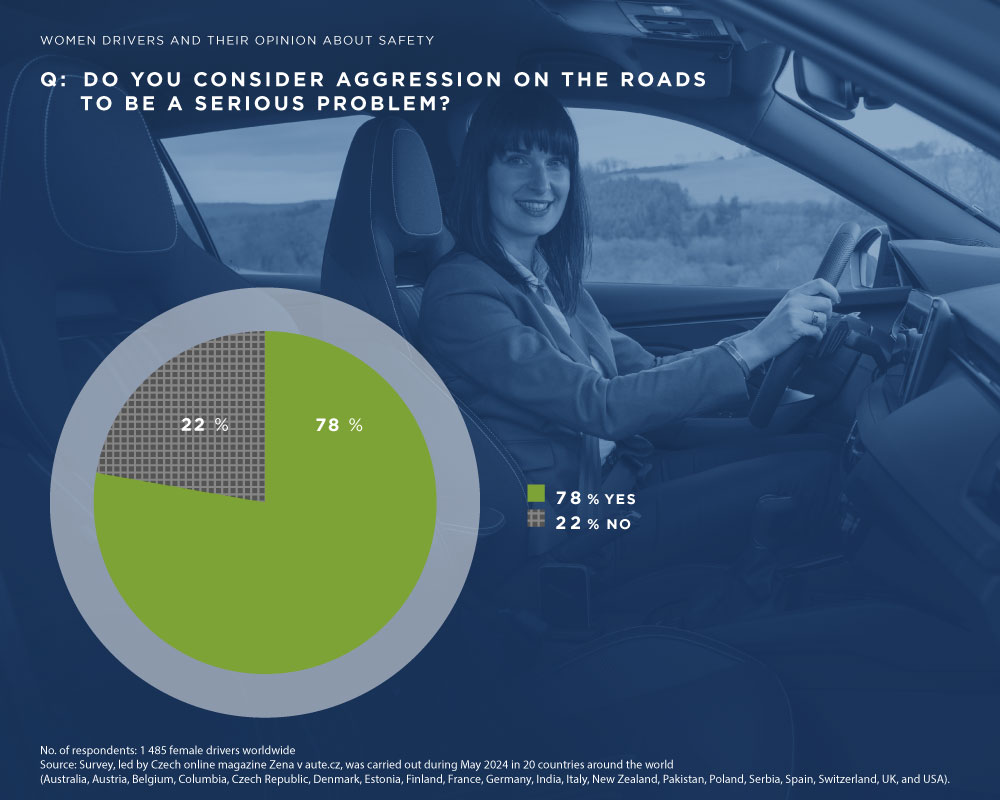 Prema nedavnom istraživanju sprovedenom uz pomoć Women’s Worldwide Car Of The Year žirija (WWCOTY), ukupno 78 % žena vozača agresiju na putevima smatra ozbiljnim problemom. U ispitivanju je učestovalo oko 1.500 žena vozača iz 20 zemalja sveta, među kojima je i naša zemlja (Australija, Austrija, Belgija, Kolumbija, Češka, Danska, Estonija, Finska, Francuska, Nemačka, Indija, Italija, Novi Zeland, Pakistan, Poljska, Srbija, Španija, Švajcarska, UK i SAD).