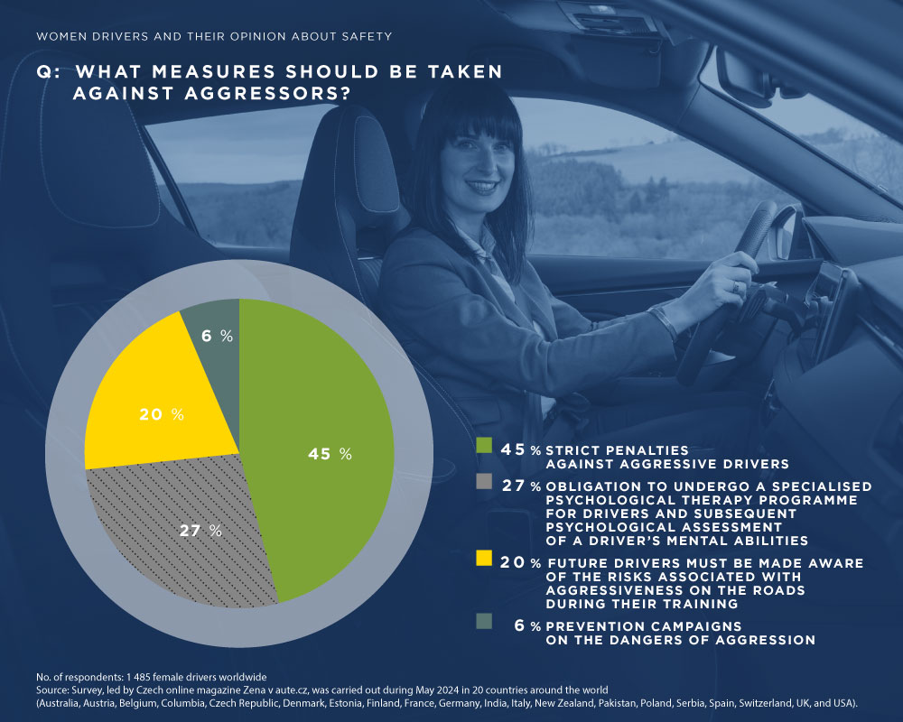 Na pitanje koje mere treba preduzeti protiv agresivnih vozača, žene vozači širom sveta uglavnom predlažu strože kazne (45 %), program specijalizovane psihološke terapije (27 %), detaljniju obuku budućih vozača (20 %) i preventivne kampanje (8 %).