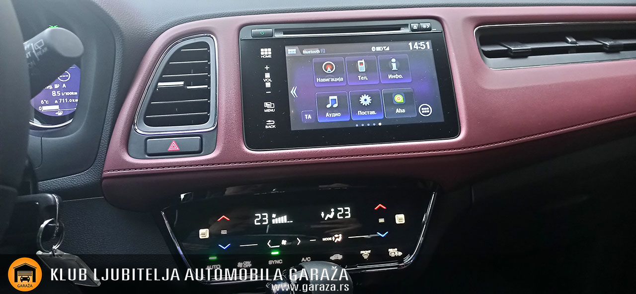 U sredini komandne table postavljen je Honda Connect + Navi, multimedijalni uređaj, kojim se upravlja putem ekrana na dodir, veličine 7″. Da, za današnje standarde, ovaj ekran bi mogao biti veći. No glavna zamerka ne ide na račun veličine ekrana već na zastarelu android platformu, u verziji 4. Sve opcije funkcionišu bez greške i pozdravljamo prevod na srpski jezik i to na ćirilićnom pismu, ali je za očekivati da se uređaj može ažurirati na neku noviju verziju. Ova verzija nema mogućnost povezivanja putem Android auto i Car play aplikacija već se može koristiti MirrorLink konekcija za mobilne telefone. Pohvaljujemo Garmin navigaciju (sve mape Evrope, uključujući i Srbiju) uz besplatno godišnje ažuriranje mapa tokom 4 godine.