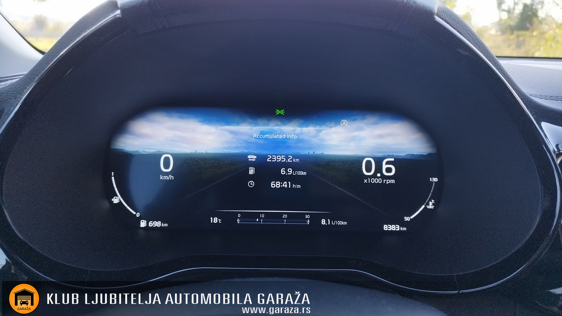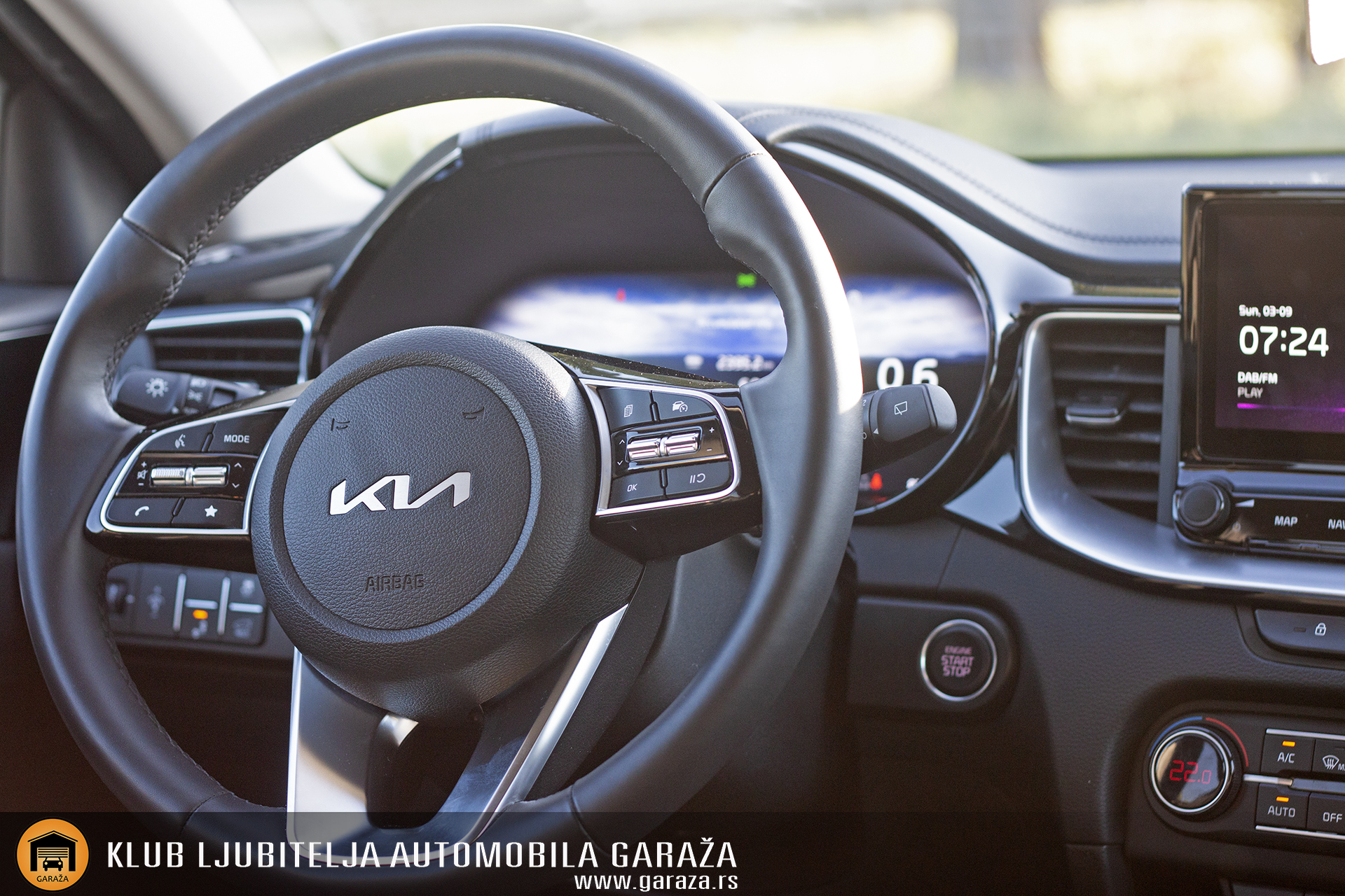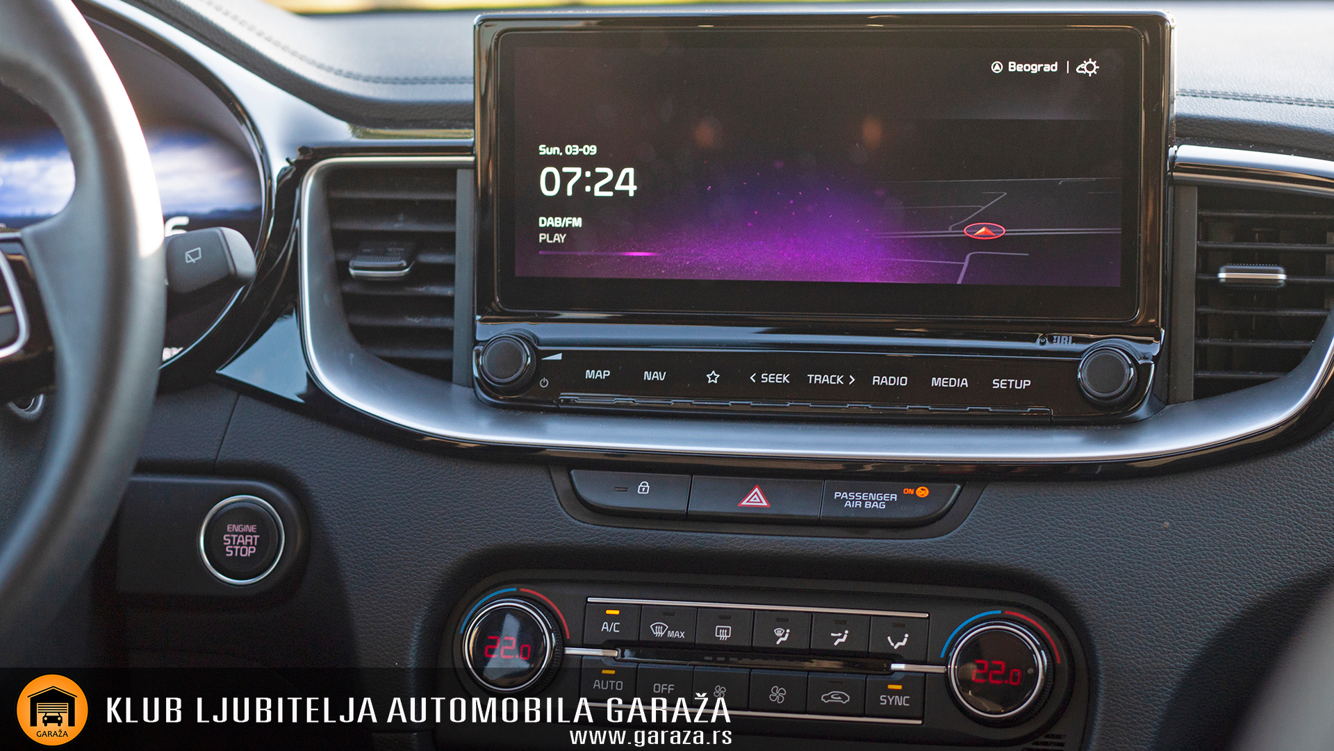 Centralno postavljen nlazi se 10,25‑inčni ekran na dodir, smešten visoko na armaturi i prati liniju upravljača, što olakšava korišćenje dok vozite. Sistem koristi Kia Connect platformu sa sopstvenom eSIM karticom: pruža real‑time informacije o saobraćaju, vremenskoj prognozi, parkingu i POI objektima. Tu su integracije Apple CarPlay i Android Auto – čak dva uređaja mogu biti istovremeno spojena putem Bluetooth‑a . Ugrađen je TomTom navigacioni sistem sa sedam godina ažuriranja mapa – idealno za naše evropske uslove. Sistem je brz i jednostavan.