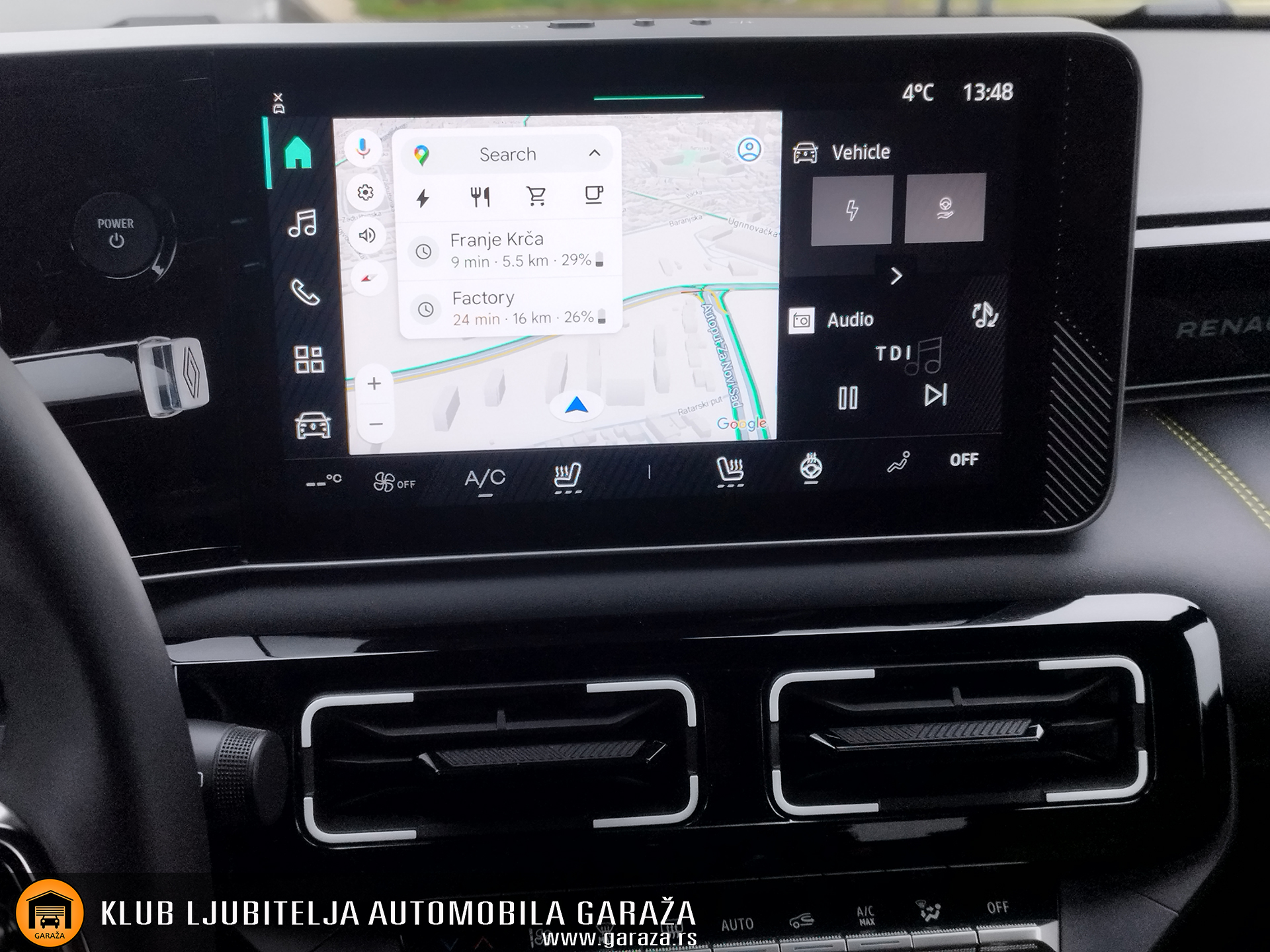 Renault 5 dolazi sa dva 10,25-inčna ekrana u vidu instrument table i ekrana multimedijalnog sistema. Sistem je zasnovan na OpenR Link platformi sa ugrađenim Google servisima, što znači da imate pristup Google Mapama sa optimizacijom ruta za punjenje, Google Asistenta i ceo ekosistem aplikacija preko Google Play Store-a. OTA (Over-The-Air) ažuriranja su podržana, što znači da će automobil dobijati nove funkcije i poboljšanja tokom svog životnog veka bez potrebe za odlaskom u servis. Ispod centralnog ekrana nalaze se otvori ventilacije, da bi ispod imali odvojene komande klima uređaja što pozdravljamo. Tu je i bežični punjač za telefon.