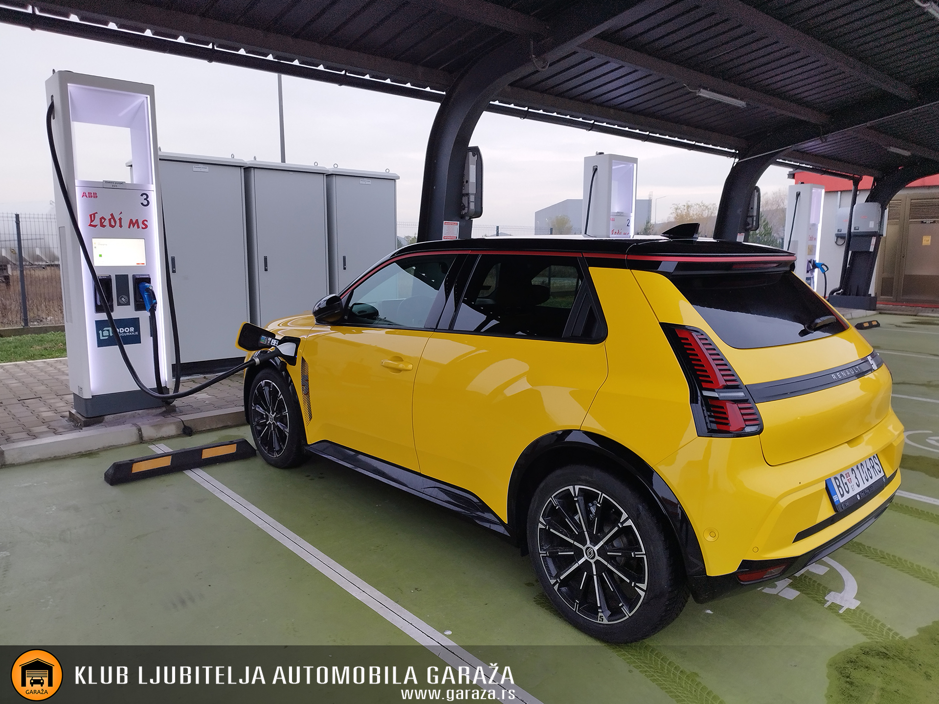 Renault 5 dolazi sa standardnim onboard punjačem do 11 kW (trofazno punjenje), što je značajna prednost u odnosu na mnoge konkurente koji su ograničeni na 7,4 kW.  Potpuno punjenje traje oko 5 sati i 45 minuta. Sa trofaznim priključkom, možete napuniti automobil preko noći bez problema. Za potrebe brzog dopunjavanja, recimo na putovanjima, Renault 5 podržava punjenje do 100 kW maksimalne snage, ali nemojte očekivati da će se i puniti tom snagom sve i da imate dostupan punjač koji to omogućava. No svakako, punjenje ne traje predugo. Od 10 do 80 % napunjenosti obično traje oko 30 minuta sa DC brzim punjačima, pri čemu prosečna snaga tokom punjenja bude oko 50 kW, jer se snaga smanjuje kako baterija dostiže viši nivo napunjenosti baterije.