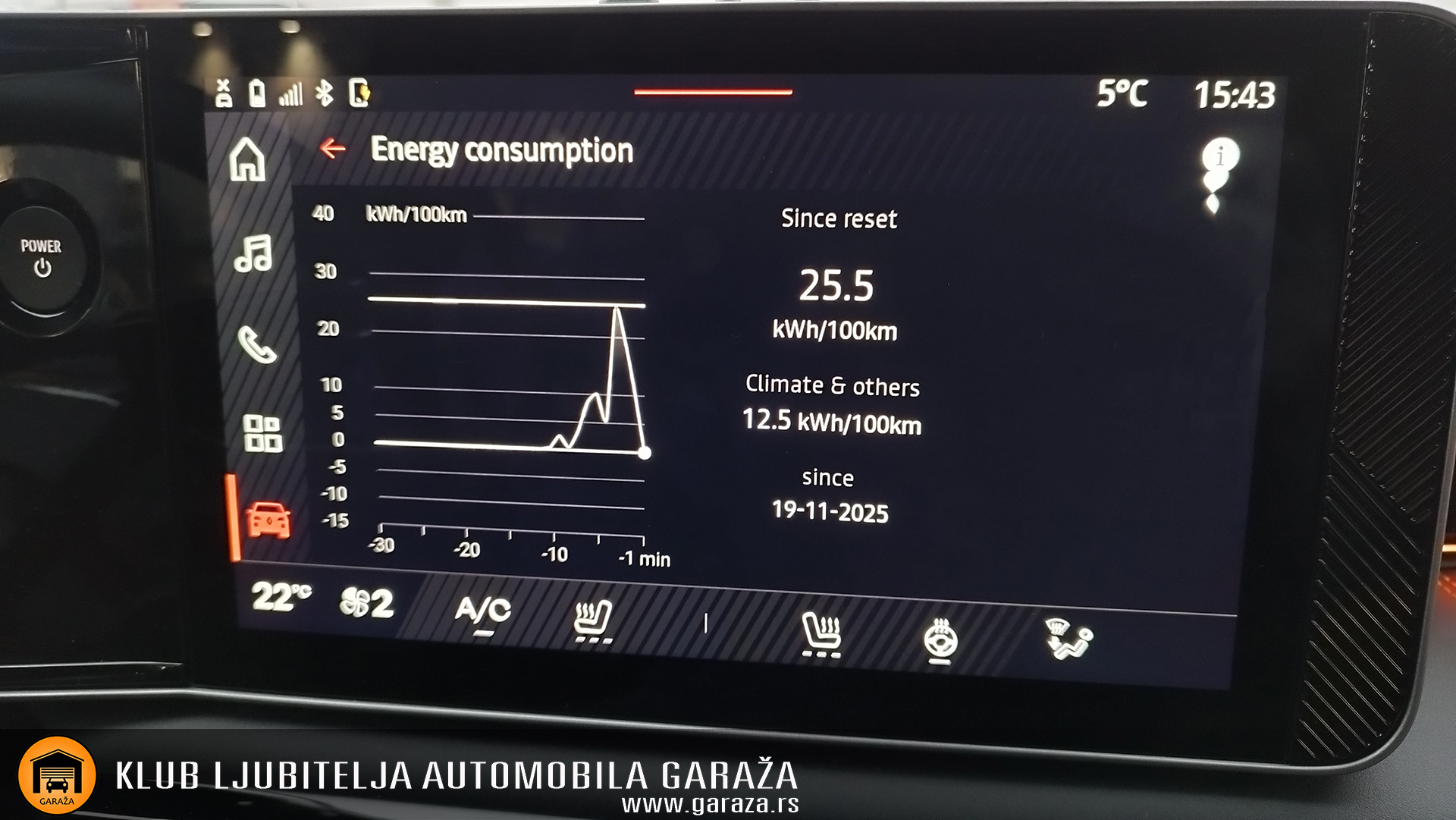 U gradskoj vožnji možemo očekivati najbolju efikasnost pri brzinama od oko 50 km/h. Očekivani domet je 370 km u gradskoj vožnji, što zvuči fenomenalno, ali uslovi moraju biti optimalni. U realnoj, mešovitoj vožnji sa prosečnom brzinom od oko 90 km/h, potrošnja je oko 14-15 kWh/100 km, što daje domet od otprilike 340 km. Ovo je scenario u kojem većina ljudi vozi, kombinacija grada, prigradskih puteva i ponekad autoputeva. U hladnim uslovima, domet pada na oko 240 km u mešovitoj vožnji, ili manje. Litijum-jonske baterije gube efikasnost na niskim temperaturama, i iako Renault 5 ima toplotnu pumpu koja pomaže, hladnoća i dalje značajno utiče na domet. Mi smo zabeležili potrošnju od 25.5kWh/100km, od čega je polovina bila rezervisana za klimatizaciju i druge urerđaje. Ne zaboravimo da Iconic paket obuhvata toplotnu pumpu koja pomaže pri efikasnijem grejanju kabine i održavanju optimizovanog dometa zimi. Bez toplotne pumpe bi situacija bila daleko nepovoljnija po pitanju potrošnje, odnosno dometa u zimskim uslovima.