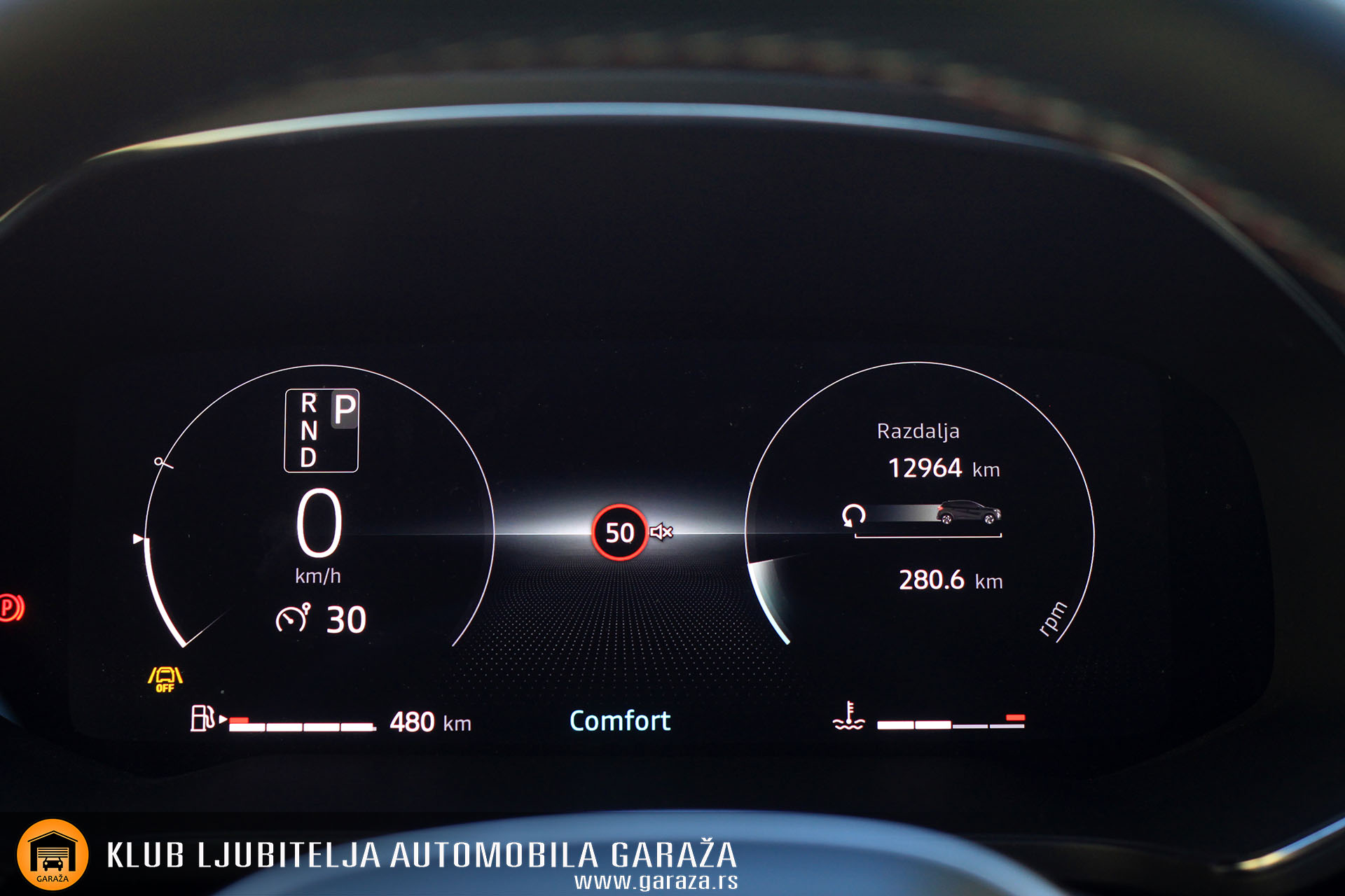 Testirani model pokreće 1.3-litarski TCe motor sa 160 KS i 270 Nm obrtnog momenta, uparen sa 7-stepenim EDC automatskim menjačem. Ovo je ubedljivo najsnažnija verzija, ali moramo napomenuti da se Captur nudi u nekoliko verzija snage, počevši od verzije sa 90KS, a u ponudi su i mild hybrid kao i full hybrid verzije. Najsnažnija verzija, koju imamo na testu, postiže ubrzanje od 0 do 100km/h za 8,5 sekundi,dok ni brzina od 200km/h nije nedostižna za ovaj model. Po pitanju potrošnje, nismo se makli iz grada, ali je ona ostala ispod 9 litara. My driving meni, u okviru multimedijalnog sistema, prikazuje istoriju potrošnje. Prema prikazanoj evidenciji potrošnja se kreće između 8 i 9 litara, a svakako da može biti i manja.