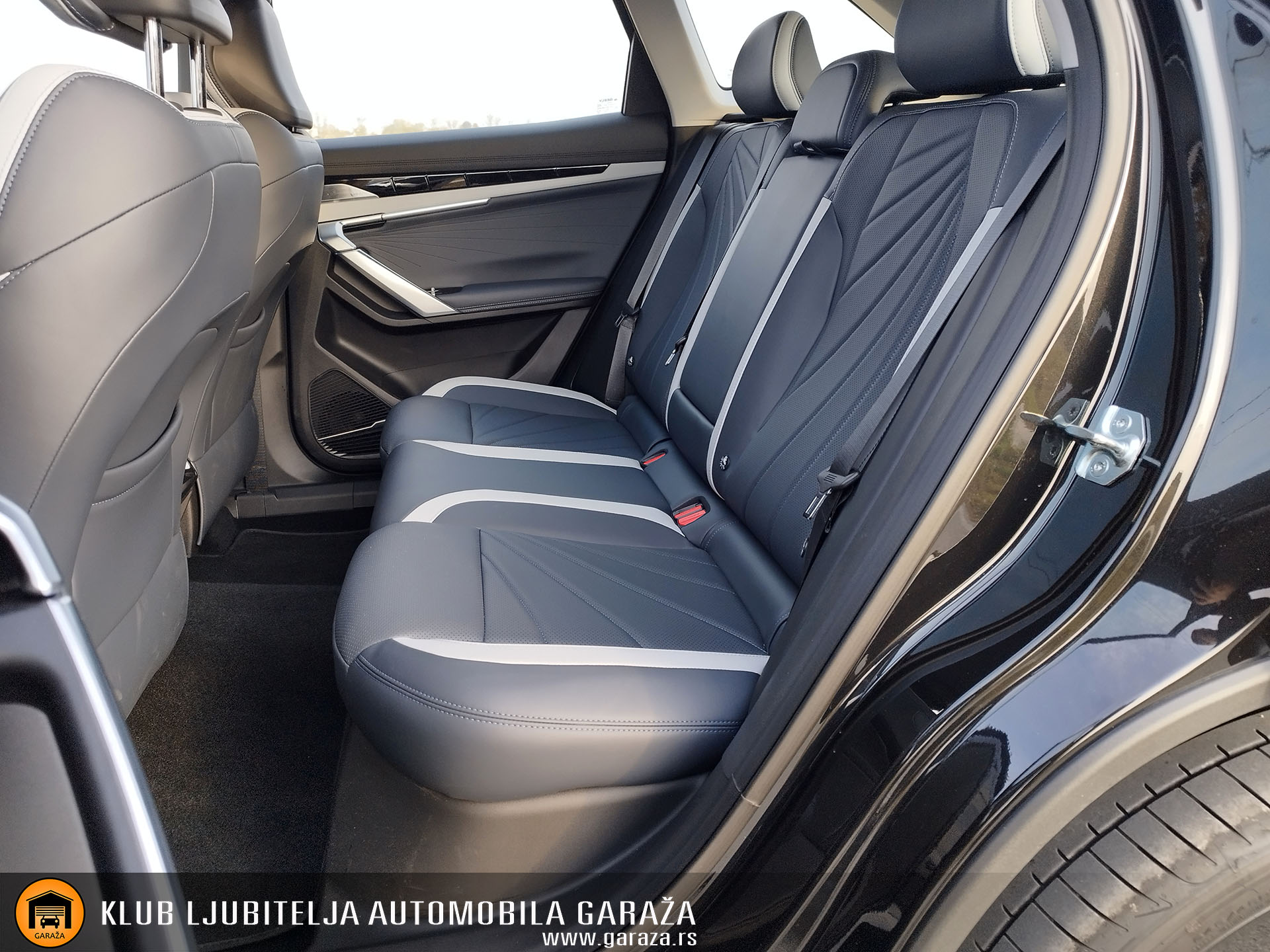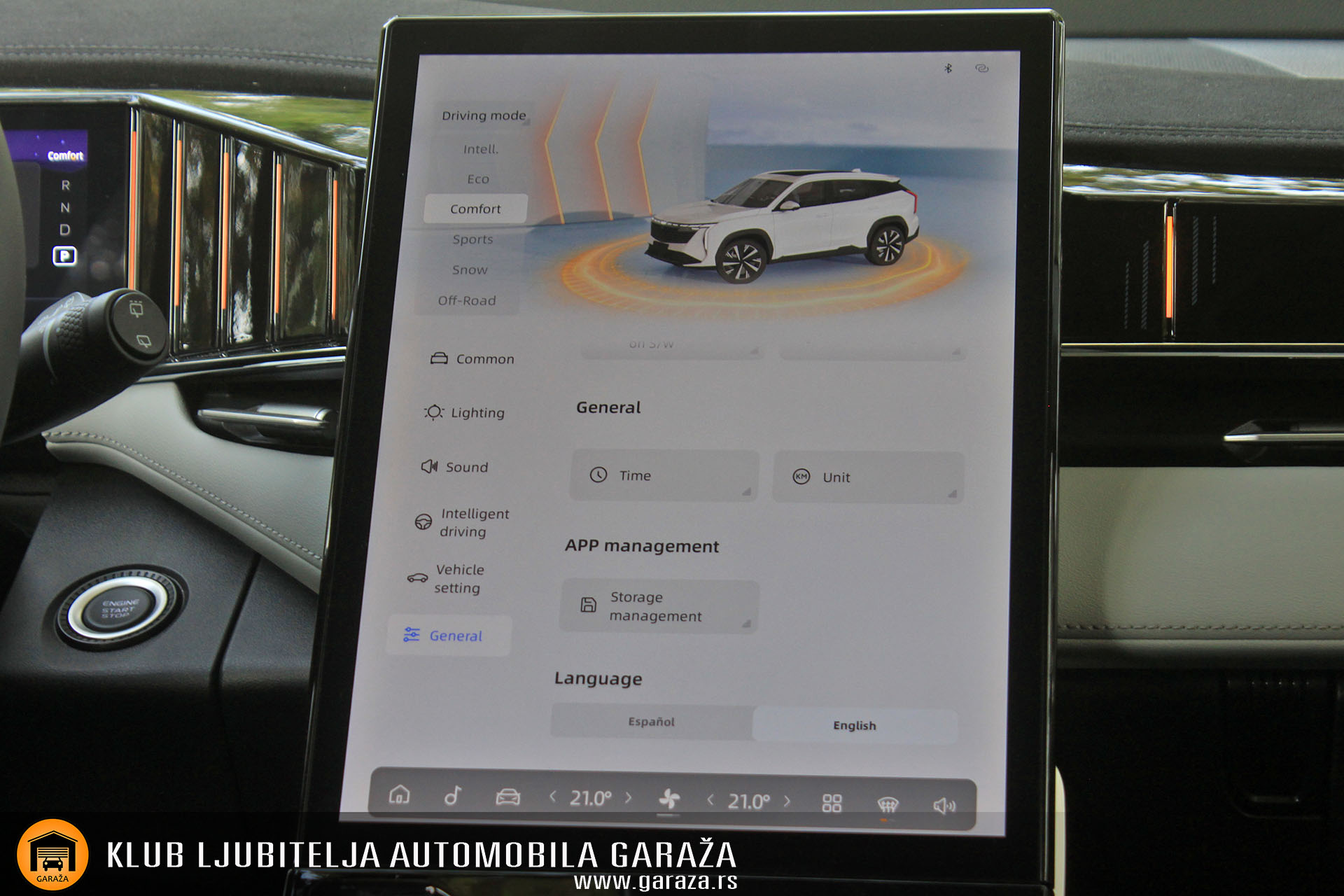 Najimpresivniji dojam u enterijeru donosi veliki centralni ekran dijagonale 13,2 inča, na kom su prikazane opcije multimedijalnog uređaja, ali takođe i podešavanje klima uređaja. Pozdravljmo prisutne prečice u samom podnožju što olakšava upotrebu određenih funkcija. Primećujemo da je omogućena Apple CarPlay aplikacija , dok Android Auto aplikaciju nismo zapazili, što vidimo kao jedan od retkih nedostataka. Prijatno smo iznenađeni velikim brojem opcija u „My Car“ meniju. Ovde nalazimo brojna podešavanja; zvuk, režim vožnje (Economy/Sport/Comfort/Intelligent), pogonski sklop, svetla, automatski parking… Čak možete birati da li želite da se mobilni telefon puni bežično. Zaista puno nekih opcija koje ne viđamo kod drugih modela.