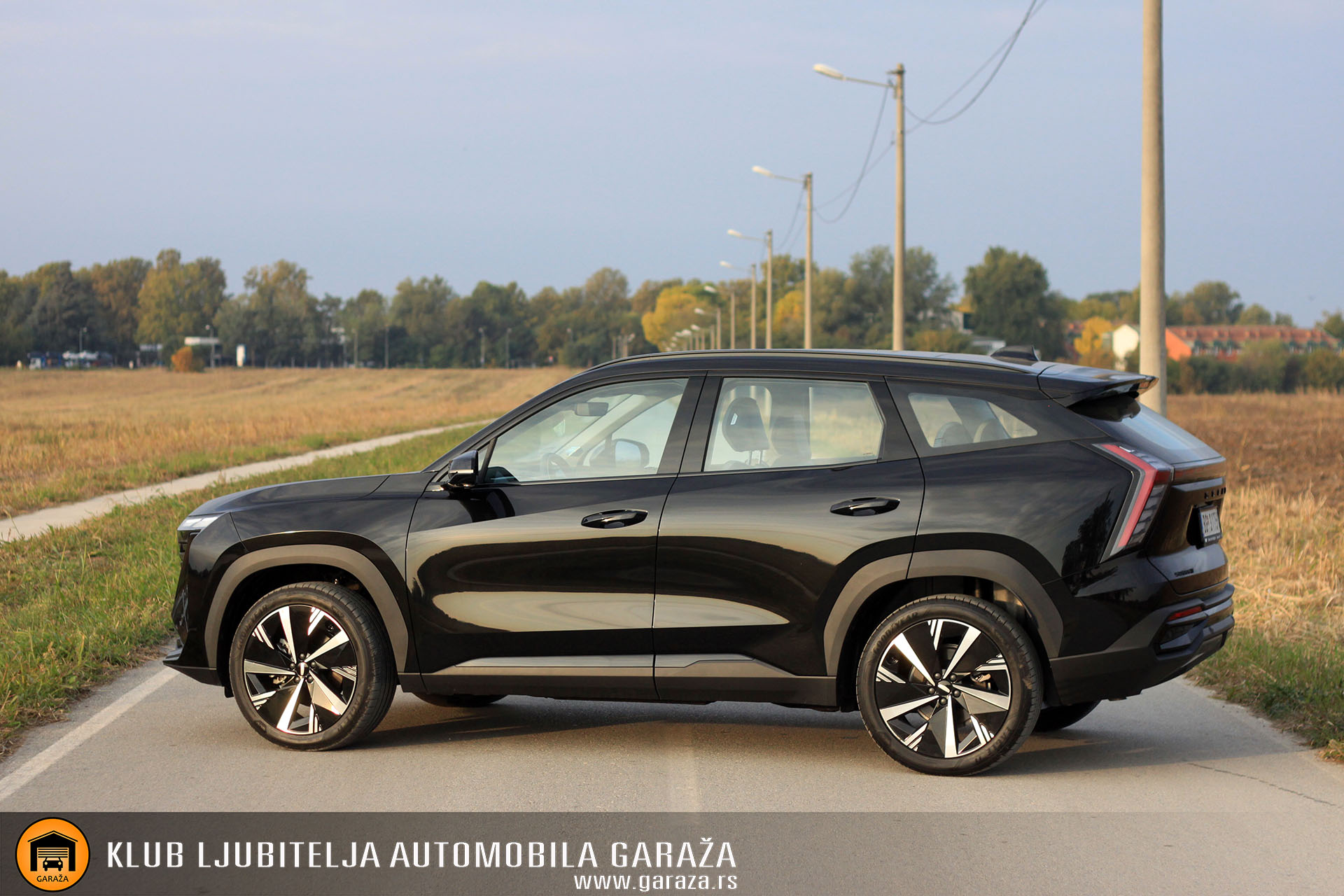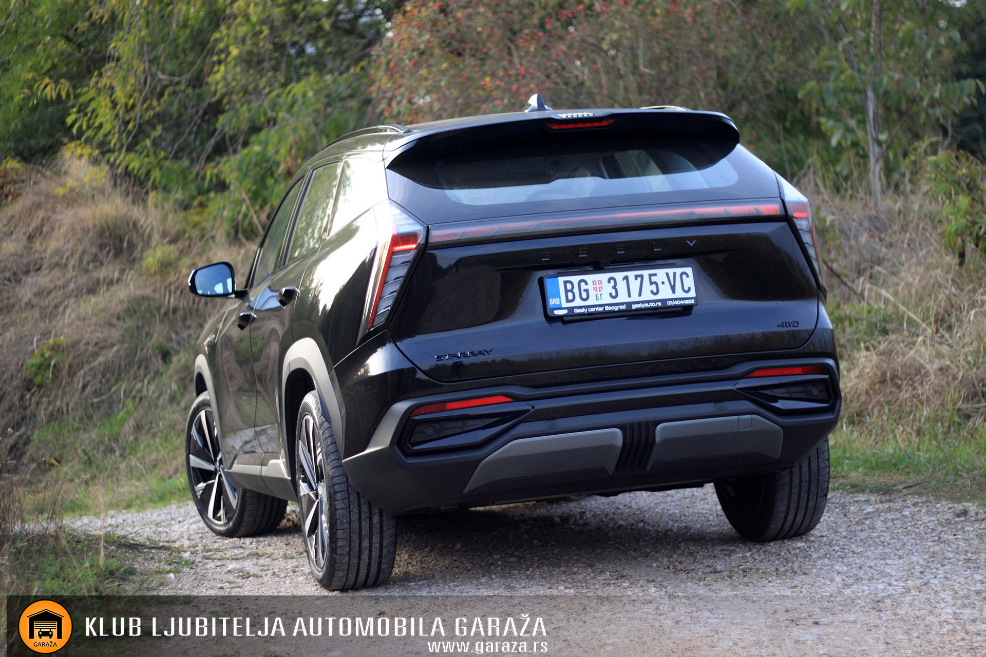 Pod haubom testnog primerka se nalazi dvolitarski turbo benzinski agregat koji razvija, nimalo skromnih, 238 KS  i 350 Nm obrtnog momenta. Snaga se prenosi na primarnu, prednju osovinu, putem 8-stepenog automatskog menjača. Geely koristi BorgWarner-ov inteligentni AWD sistem sa Torque On Demand tehnologijom. Ovo praktično znači da sistem automatski šalje snagu na zadnje točkove kada je to potrebno.  U zavisnosti od uslova vožnje, sistem može distribuirati do 50% obrtnog momenta motora na zadnje točkove. Ovo osigurava da vozilo zadrži pogon i stabilnost čak i u izazovnim uslovima kao što su mokri, snežni ili zaleđeni putevi.