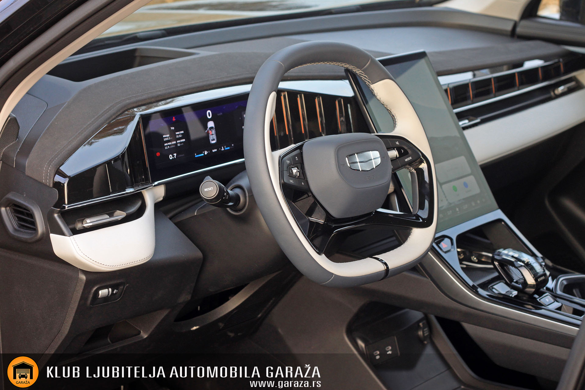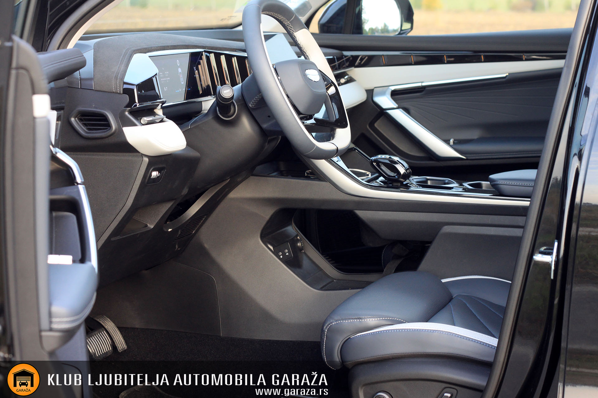 Veliki ekran multimedije dominira centralnom konzolom, za razliku od ekrana instrument table koji ni nema potrebe da bude veći jer možete lako aktivirati HUD. Samim tim, sve neophodne informacije su prikazane na vettrobranskom staklu, a na instrument tabli se mogu videti dodatne informacije. Posebno nam se dopalo kako je rešeno ambijentalno osvetljenje. Za razliku od većine gde imamo horizontalne linije duž panela, ovde vidimo kraće vertikalne linije širom prednjeg dela enterijera. Naravno, moguće je birati boju iz celokupnog spektra boja.