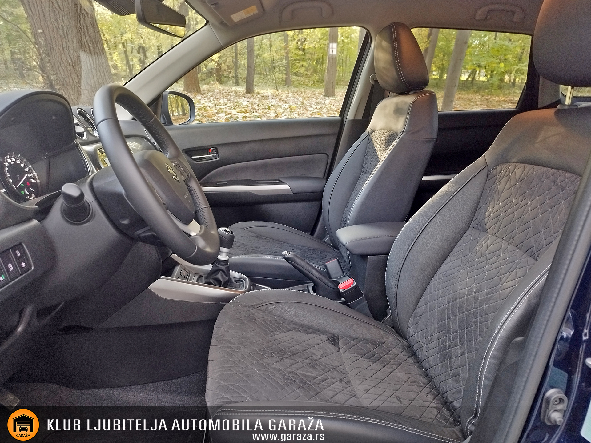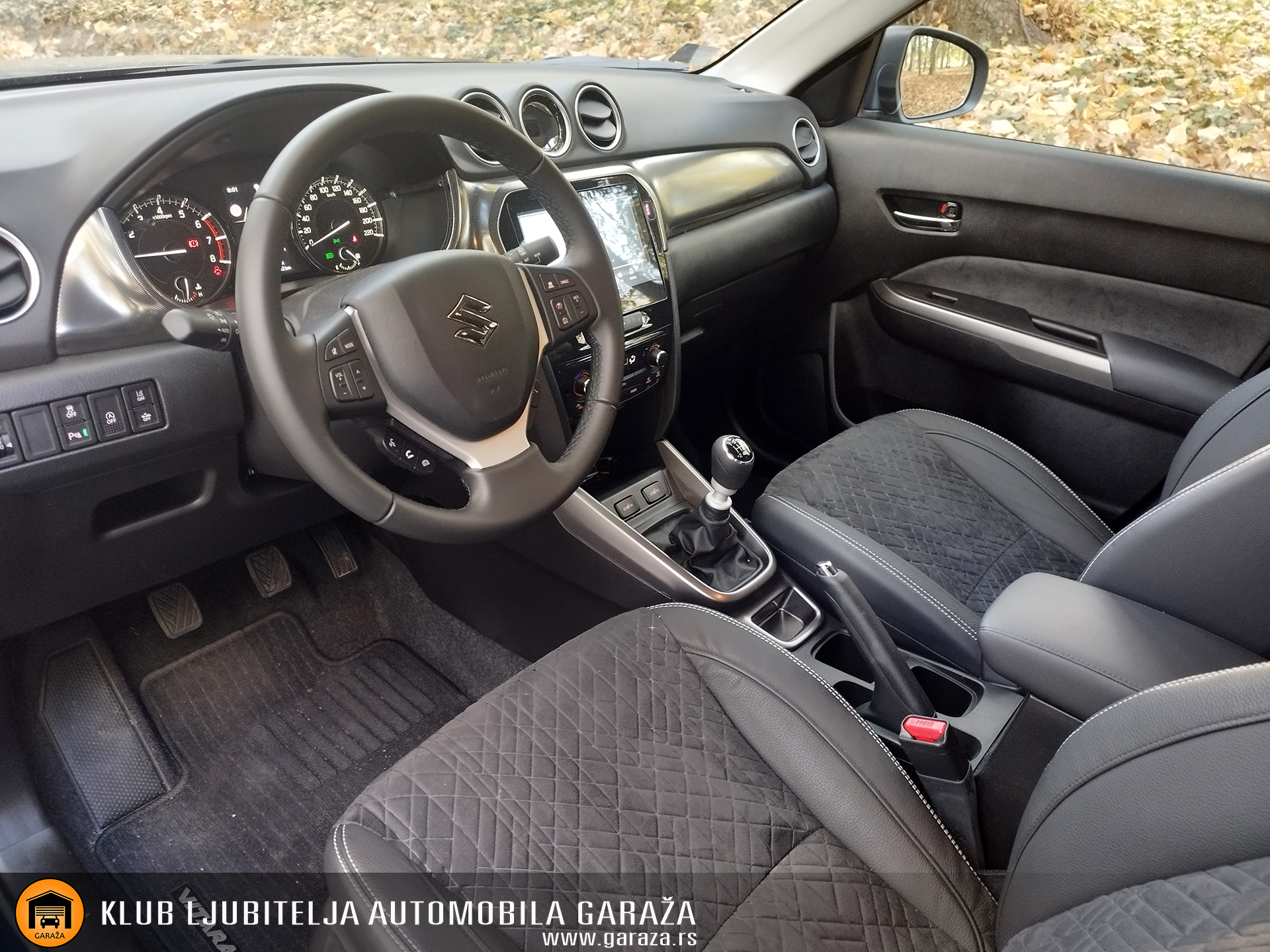 Unutrašnjost Vitare u Elegance paketu ostavlja veoma dobar utisak. Sedišta su posebno zanimljiva u ovoj kombinaciji kože i alkantare, prošivena belim koncem kao poseban detalj. Kao i kod većine vozila ove klase, prisutno je dosta plastike, ali ovde primećujemo i da je gornji deo komadne table obložen mekanom plastikom, kao i da je središnji deo vrata obložen alkantarom. Monotoniju tamnih boja razbijaju paneli u svetlo sivoj boji, a opšti utisak je da je kvalitet izrade vrlo solidan i ne odstupa od standarda koji nude i drugi u ovoj klasi.