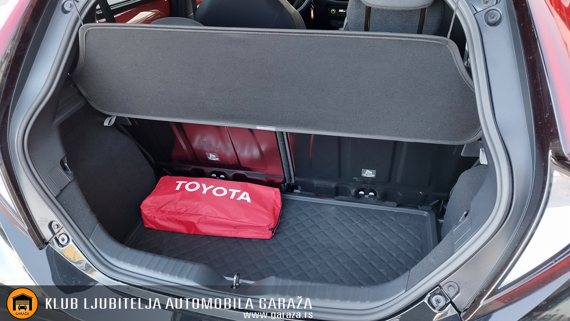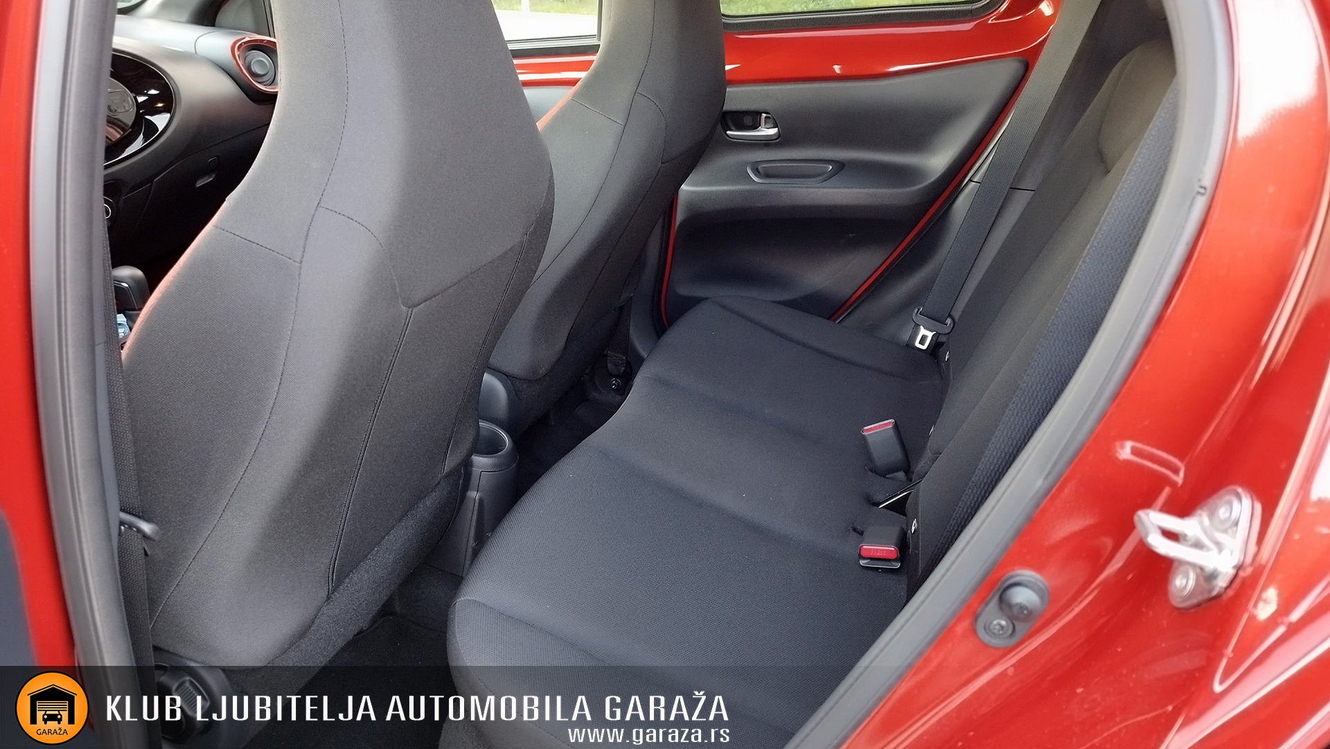 Iako je dužina celog automobila samo 3.7 metara, Toyota je našla dobru formulu za organizaciju kabine gde se na prednjim sedištima može udono smestiti dve odrasle osobe, dok je na zdnjoj klupi već pomalo tesno, ali nije nemoguće smestiti se ukoliko niste natprosečno visoka osoba. Odajemo priznanje konstruktorima na trudu, kako bi se prostor maksimalno funkcionalno iskoristio. Svakako odlično je što Aygo X ima drugi par vrata, pa je pristup zadnjoj klupi neuporedivo lakši. Ne samo što će odrasla osoba lakše pristupiti zadnjoj klupu, već će se mnogo lakše prići, recimo, dečijem sedištu. Konstruktorsko rešenje da Toyoti Aygo X ponudi više prostora od očekivanog je nađeno u tome da se sedi nešto više (za 55mm) i nešto uspravnije. Ovim rešenjem unapređena je preglednost, a našlo se mesta i za prtljažnik zapremine 231 litre.