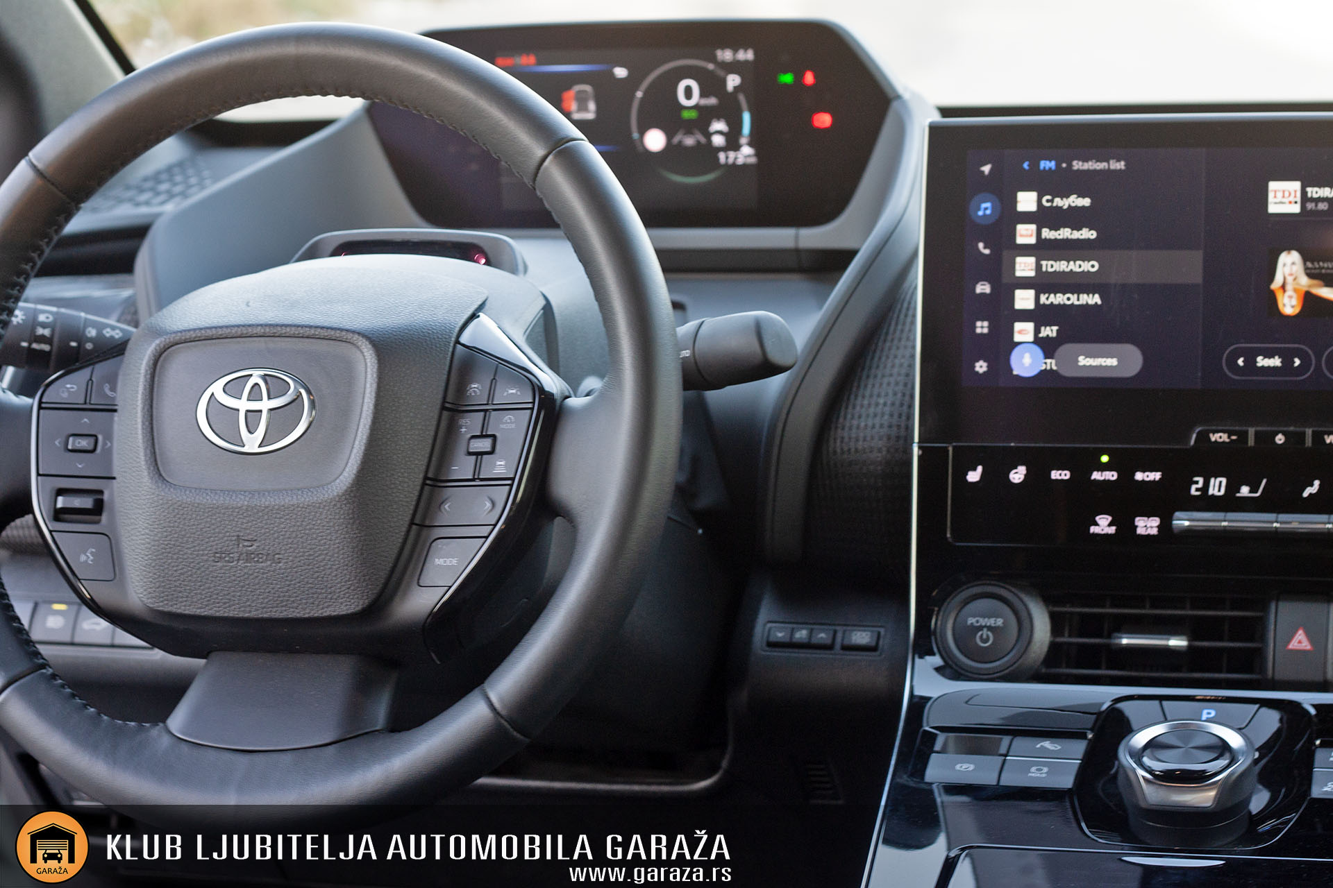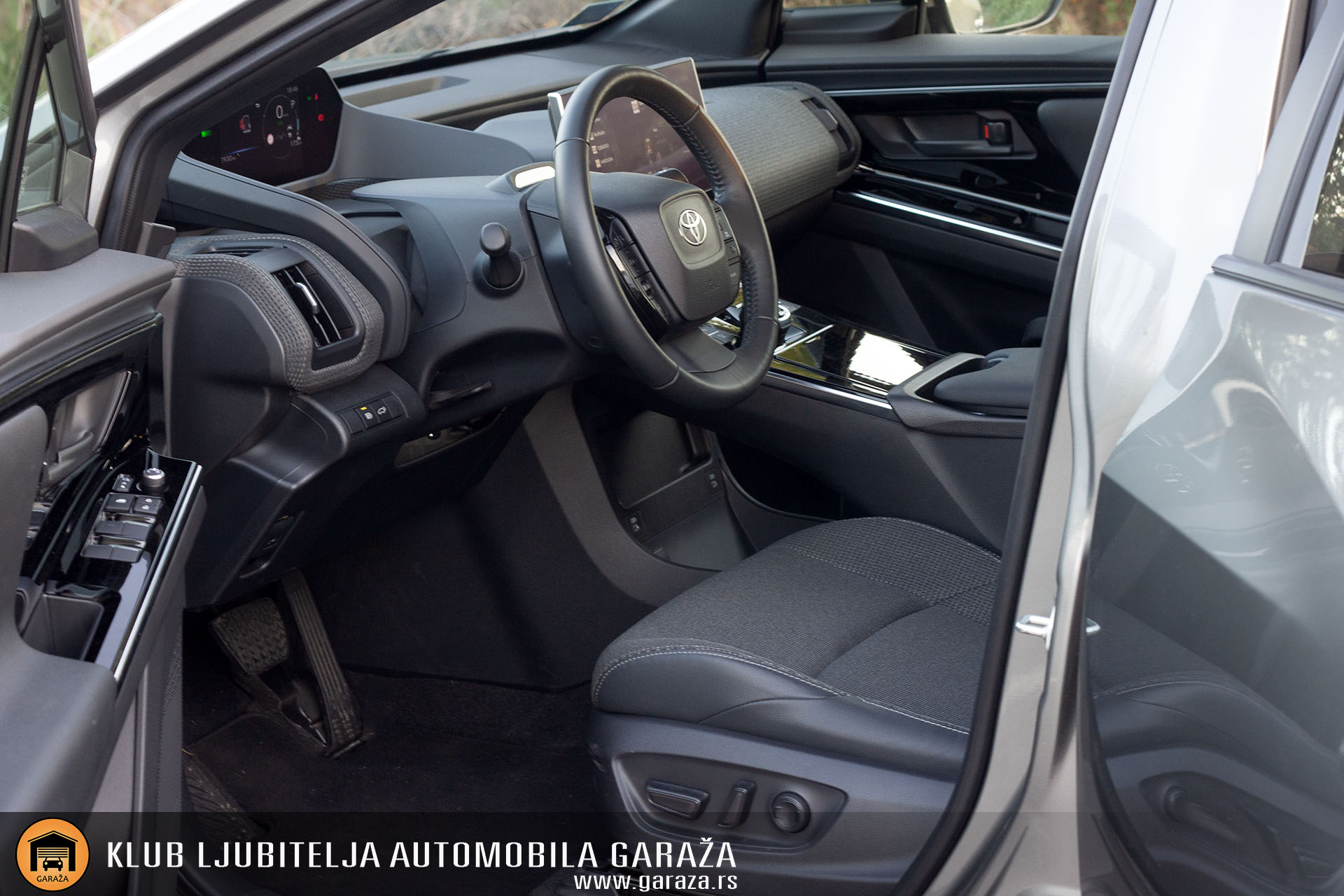 Unutrašnjost bZ4X-a je prostrana i moderna, sa nekim rešenjima koje sada po prvi put vidimo kod Toyote. Međuosovinsko rastojanje iznosi 2.850 mm što se odmah i primeti. Vozačev položaj je specifičan. Naime, instrument tabla je postavljena visko i gleda se iznad upravljaća, koji mora biti niže postavljen. Slično rešenje imamo kod Peugeota. Sedišta su udobna i podesiva po visini, bar napred. Ipak, zbog baterija smeštenih u podu, zadnja sedišta su nisko postavljena u odnosu na pod, što odraslima može predstavljati problem na dužim putovanjima.
