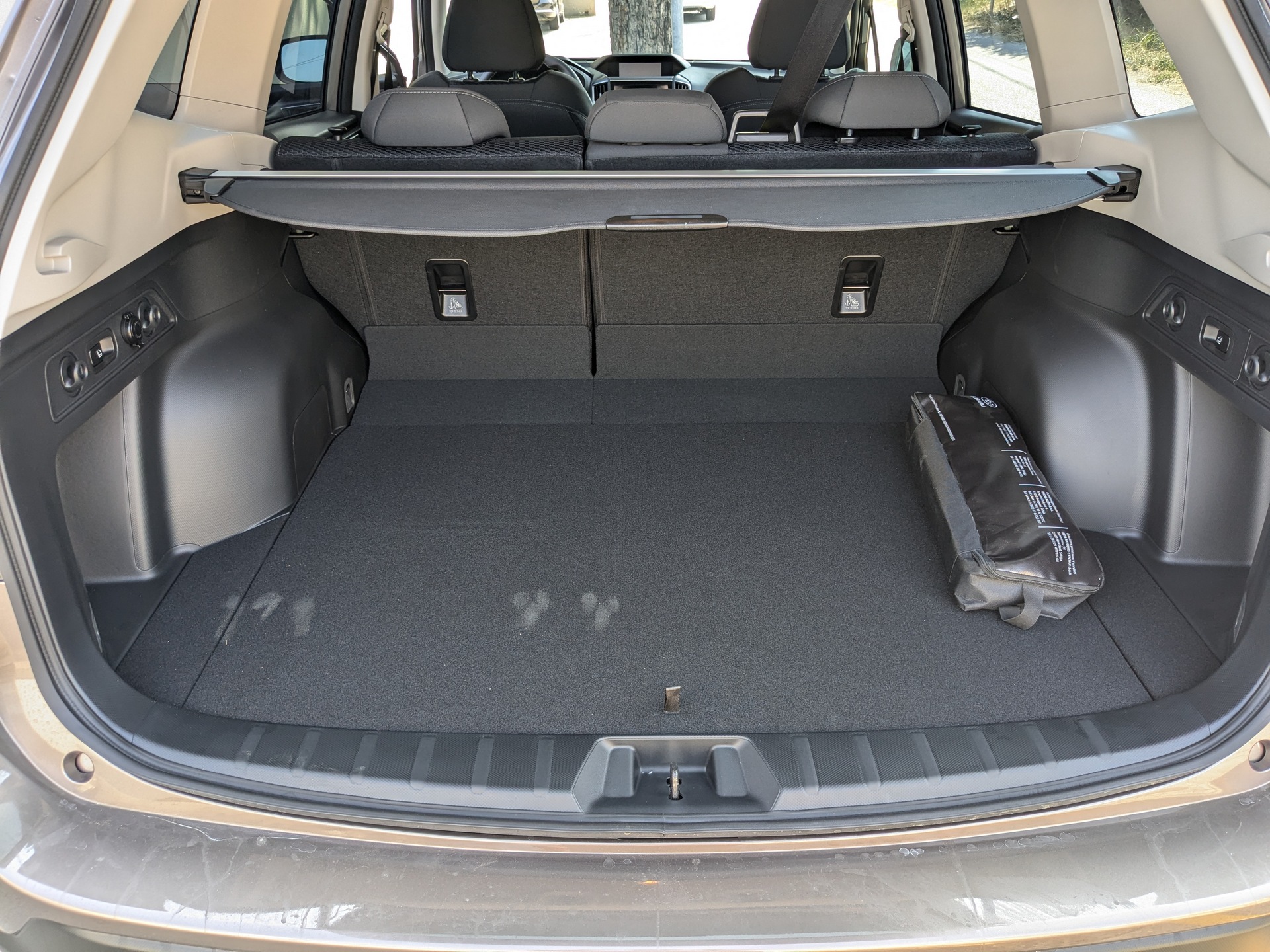 Forester sada već prethodne generacije je izdašnih dimenzija i na samom vrhu je SUV-C klase vozila sa svojih 464 x 182 x 173 cm (d x š x v). U pomenutoj klasi, neki konsenzus je da Honda CRV (koja je sa poslednjom generacijom JOŠ porasla) i Forester nude najviše unutrašnjeg prostora od svih konkurenata, praktično sustižući i pojedine modele iz SUV-D „ekipe“. Takođe, gepek (509l) je zaista praktičan i pravilnog oblika; pritom, u najširem delu dostiže čak 135 cm, dok je između točkova širina 110 cm. Dubina je 92 cm na sredini (gde je najdublji). Kako se i zadnja sedišta (deljiva u odnosu 60:40) mogu spustiti polugama iz samog gepeka, očito je vrlo pogodan za prevoz kabastih predmeta – što naša nedavno preuzeta nova veš-mašina i potvrđuje. Ispod pregrade u podu postoji manji prostor u koji lagano stanu prva pomoć, krpe za brisanje auta posle pranja i set za reparaciju gume – rezervnog točka nema, pošto je baterija hibridnog sistema zauzela prostor koji je u prethodnoj generaciji služio tome.