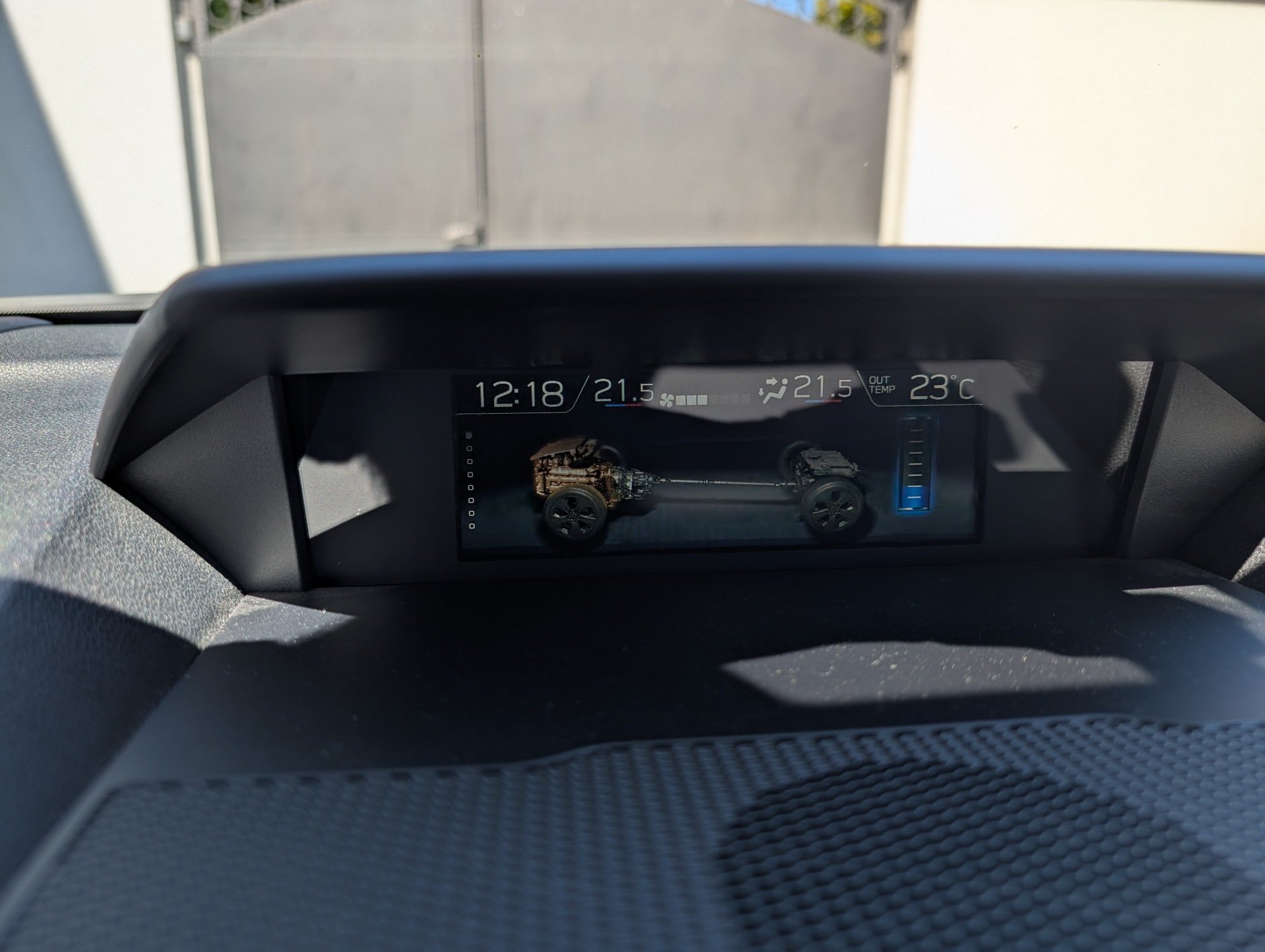 Vozački kokpit je prilično tradicionalan. Instrument-tabla ima cajgere (da, dobro ste pročitali), između kojih je manji ekran bord-kompjutera, dok glavni ekran infotejnmenta zaista služi samo za kontrolu telefona, navigacije, muzike, radia i sličnog: komande za klimu, grejanje sedišta, modove vožnje i sve ostalo su date u vidu mnogih dugmića, kako po kokpitu, tako i na volanu! Pristup koji je mom shvatanju vozila prosto nenadmašan. Ako nešto ne volim kod modernih (posebno EV) vozila, to je što se odjednom sve kontroliše preko glavnog ekrana… Ne i u Foresteru, koji pored toga poseduje i JOŠ jedan ekran, postavljen iznad glavnog, ali znatno bliže vetrobranu, a koji nudi informacije vezane za trenutnu angažovanost pogona (koji motor radi, da li se baterija puni i slično), nagibe vozila (što u off-road vožnji itekako znači), dodatne podatke o potrošnji, informacije o sistemima asistencije ako su aktivirani i slično. U višim paketima opreme, na desnom retrovizoru se nalazi kamera usmerena ka napred, koja pomaže u off-road vožnji i eventualnim parkiranjima blizu nečega sa desne strane: njena slika se takođe reprodukuje na ovaj ekran.
