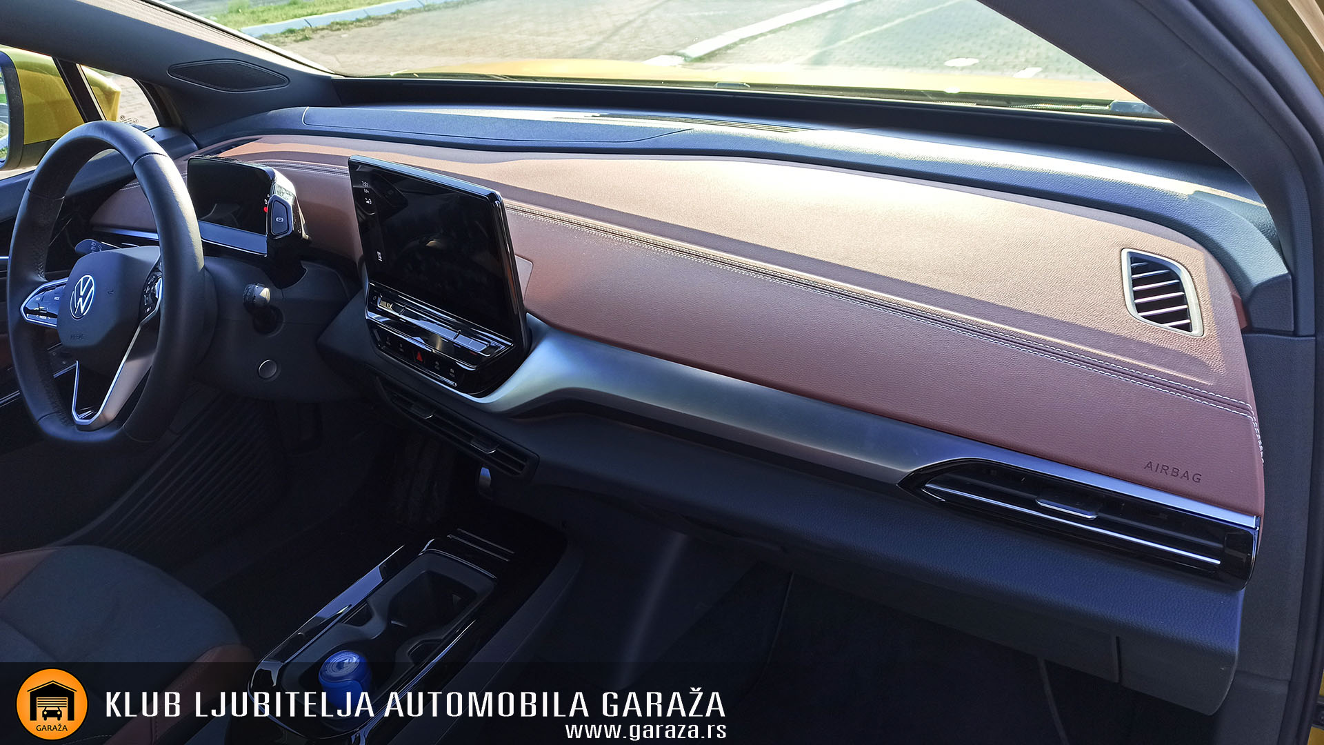 Enterijer koji je dobrim delom presvučen kožom već na prvi pogled odiše elegancijom. Ipak Volkswagen se potrudio da ne uživaju samo oči već se i pod prstima oseća kvalitet odabranih materijala. Središnja konzola oivičena sjajnom crnom plastikom izgleda odlično mada možda i nije bilo potrebe za tim jer se stalno dodiruje i primetni su otisci. Sa druge strane, srebrna lajsna koja odvaja gornji i donji deo komandne table pun je pogodak. Minimalistički stil je u trendu, a kada je ID.4 u pitanju on definitivno ima stila. Iako se ne možemo oteti utisku da nas enterijer podseća na modele premijum proizvođača iz Bavarske.