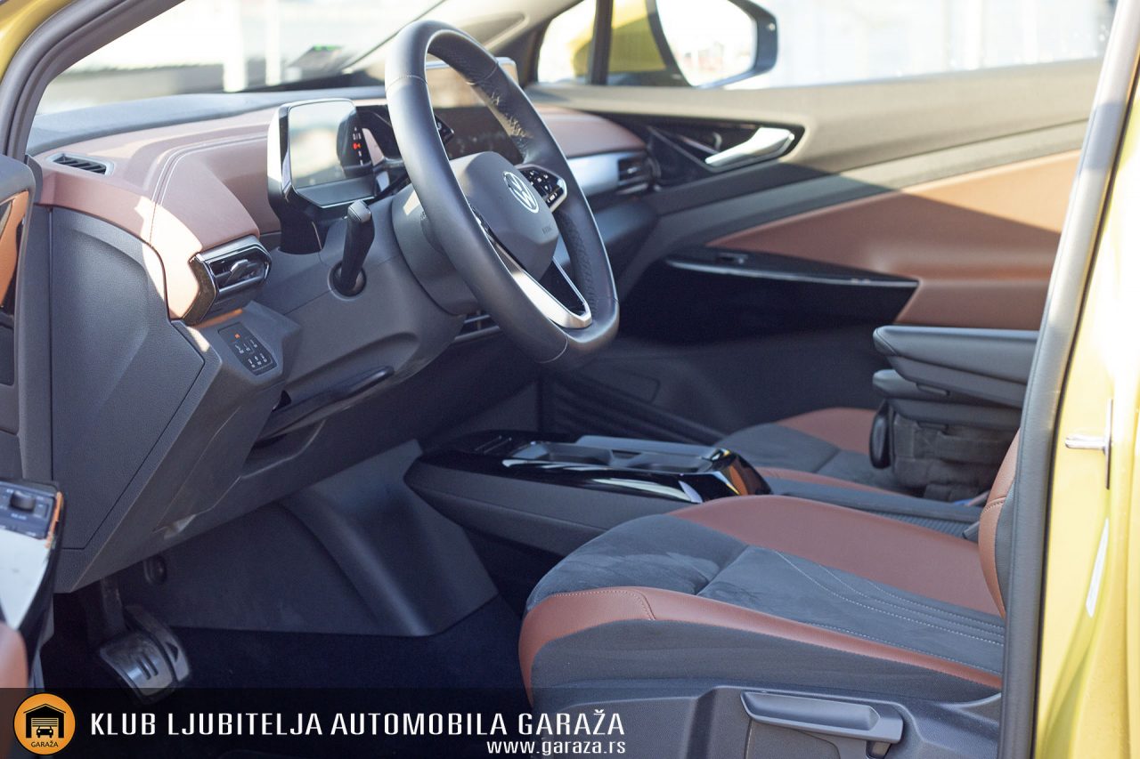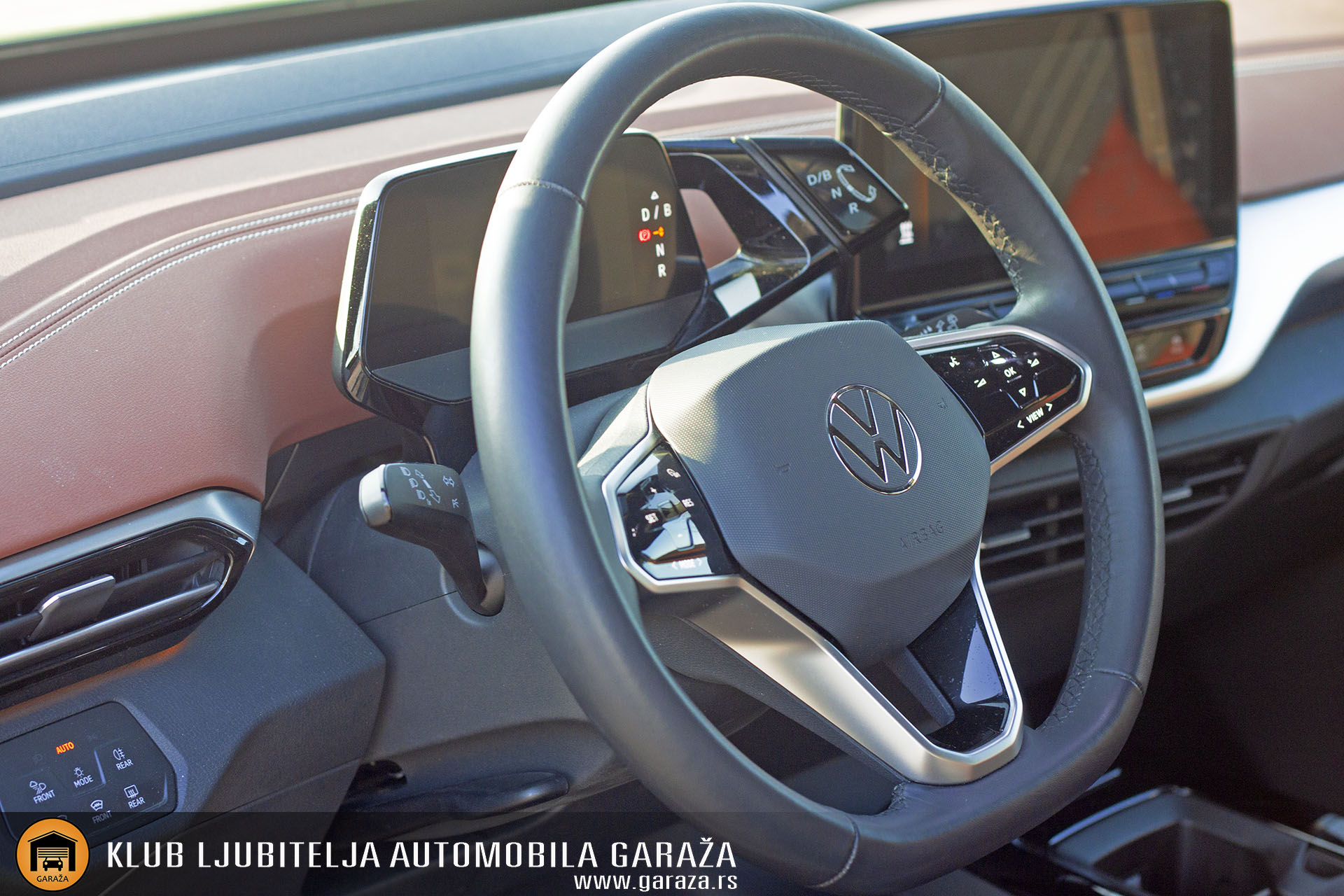 Kao što MEB plaforma nalaže, svi ID modeli su potpuno digitalni pa ni ID.4 nije izuzetak. Pošto smo se već susreli sa njegovim starijim, ali manjim bratom, instrument tabla nije novina. Ali svakako izgleda voma zanimljivo i potpuno neobično kada je ugledate prvi put. Posebna zanimljivost je i ručica automatskog menjača, ako se uopšte tako može nazvati. Na sam izgled, položaj, ali i način kako funkcioniše potrebno je kratko vreme za privikavanje. U suštini upotreba je vrlo jednostavna, a svodi se na kratak zaokret poluge ka gore ili ka dole.