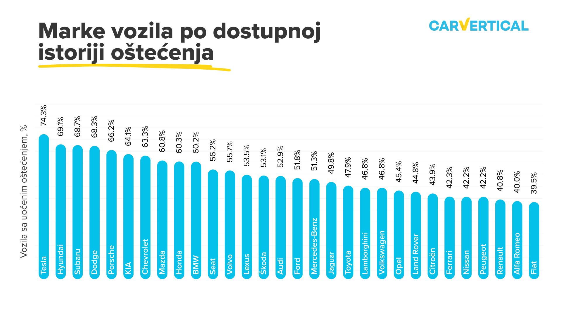 Tesla zauzima prvo mesto među najoštećenijim markama automobila – 74,3% proverenih izveštaja o istoriji Tesle imalo je evidenciju oštećenja, a slede Hiundai (69,1%) i Subaru (68,7%). Reno (40,8%), Alfa Romeo (40%) i Fijat (39,5%) su 3 najmanje oštećena brenda.