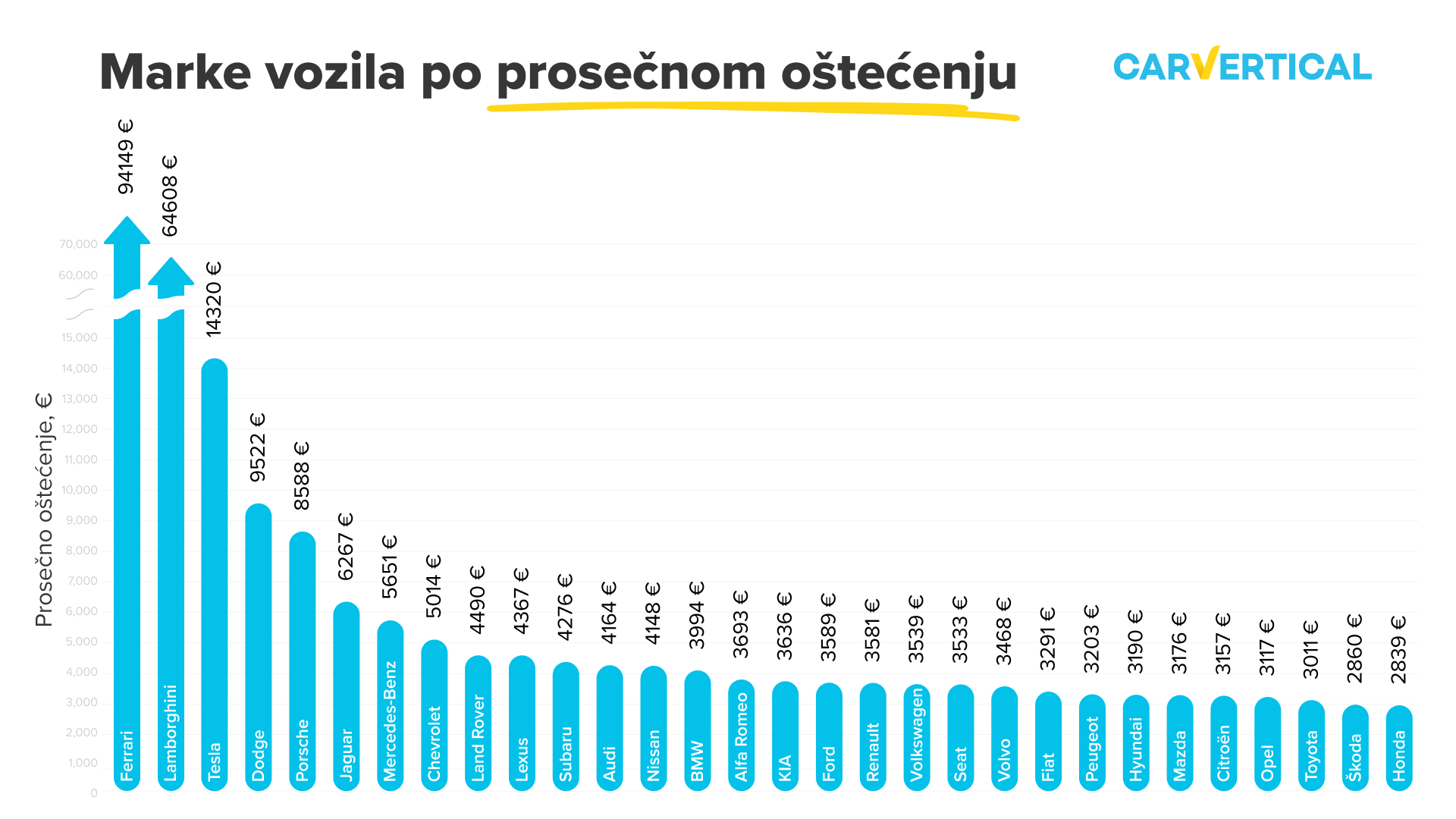 Visoka prosečna vrednost oštećenja ukazuje na to da su popravke skupe ili da su oštećenja na određenim modelima ozbiljna. Dok se egzotični automobili mogu pohvaliti desetinama hiljada troškova, prosečna šteta za BMV automobile je 3.994 evra, Folksvagen – 3.539 evra i Tojota – 3.011 evra. Istraživanje je pokazalo i globalnu prosečnu vrednost štete, koja iznosi 3.574 evra. Ovo bi trebalo da pomogne da se uporedi da li su troškovi visoki ili niski.