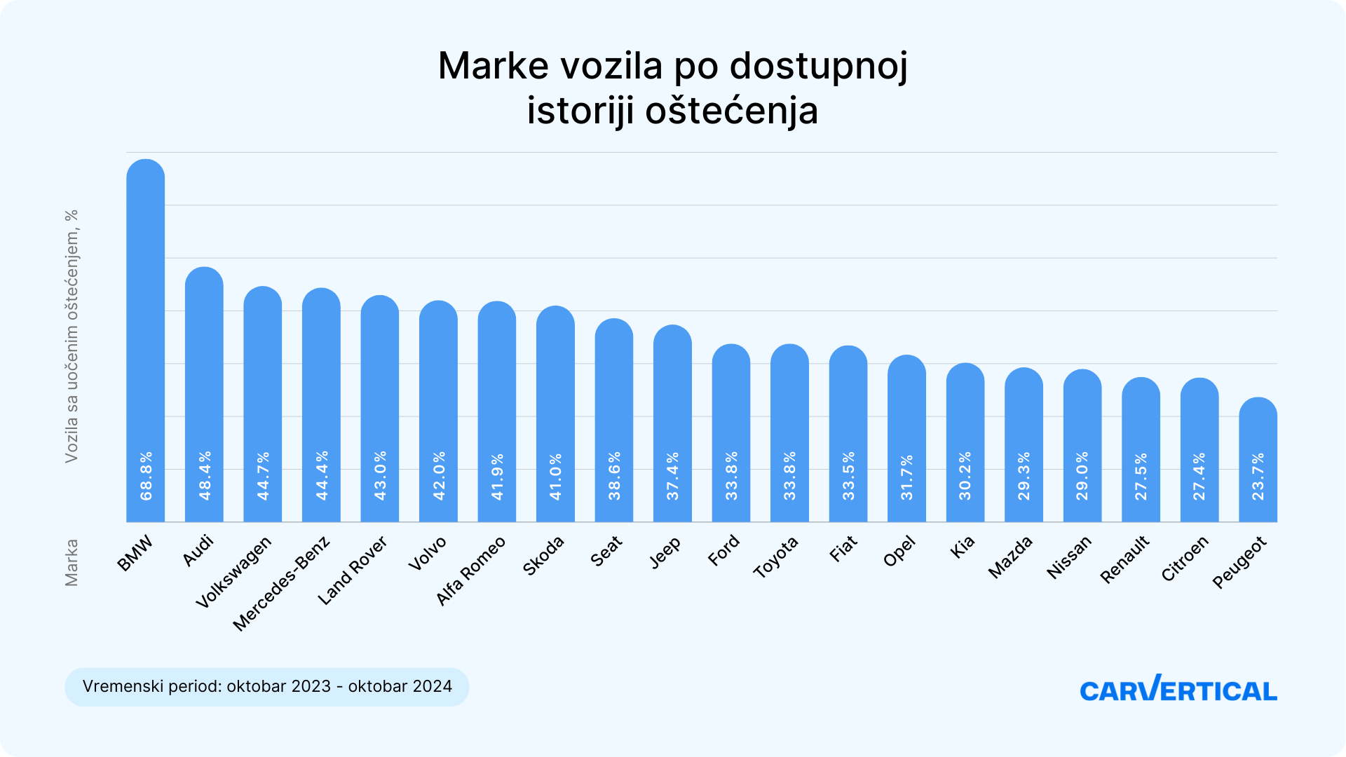 Studija kompanije carVertical analizirala je izveštaje o istoriji vozila koje su kupili korisnici kompanije od oktobra 2023. do oktobra 2024. Zapisi o šteti koji su pronađeni u izveštajima sortirani su po marki automobila, pretvoreni u procente i rangirani.