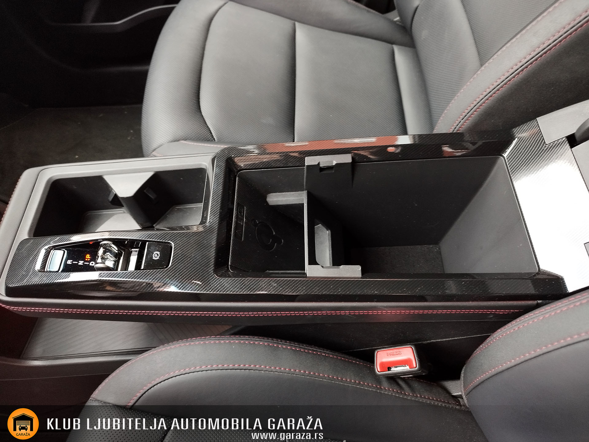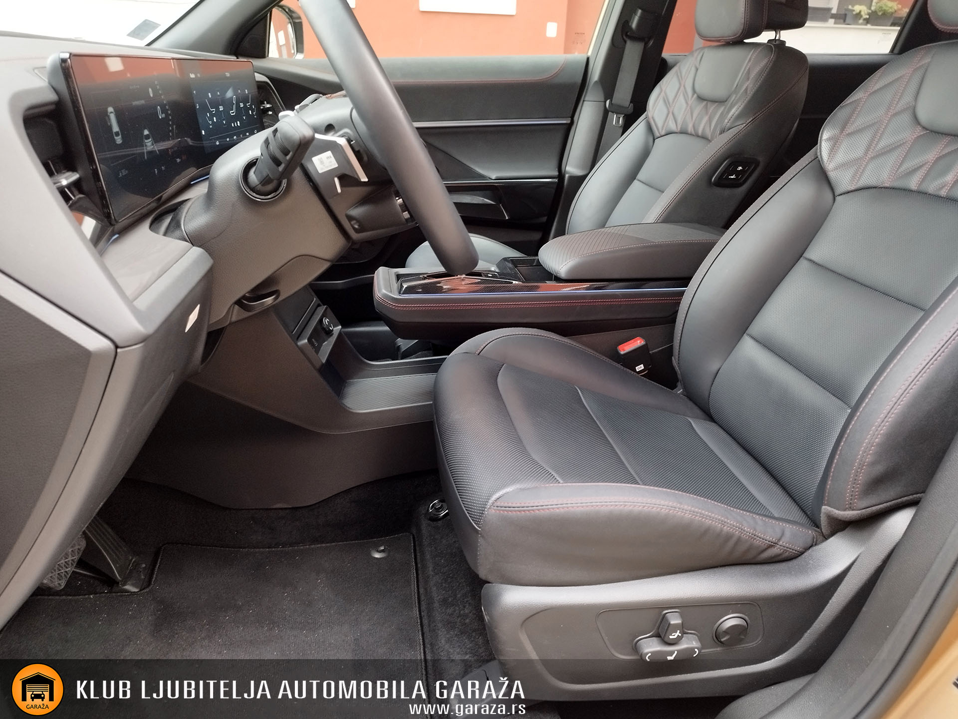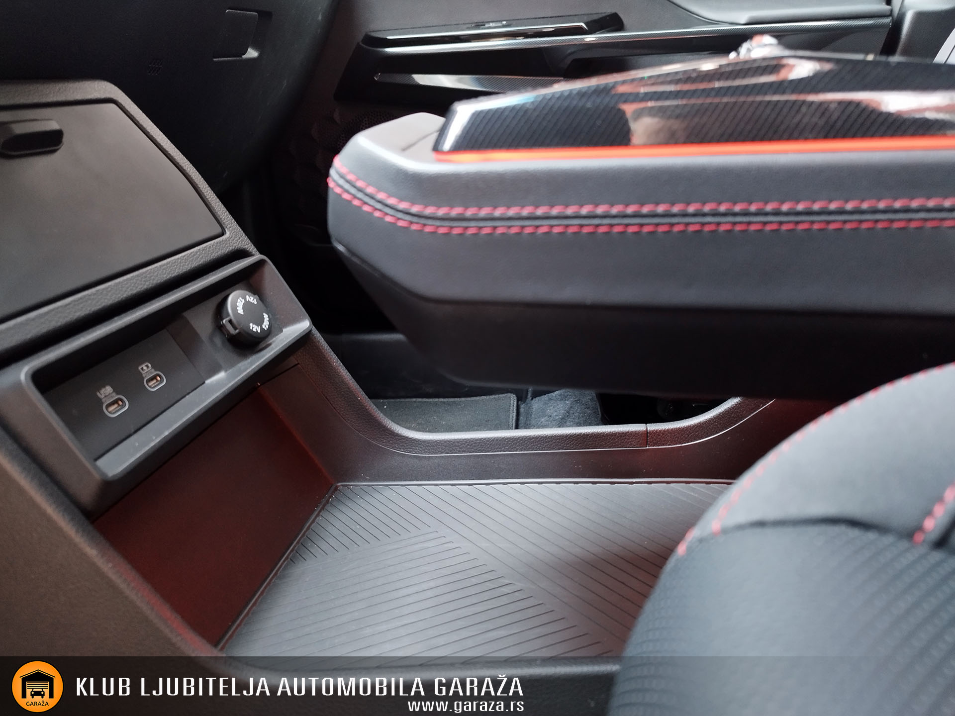 Odlično rešenje je i naslon za ruku, koji vešto krije prostor za odlaganje telefona gde se pored toga može i bežično puniti. Dopalo nam se što je zaštićen dobro tako da će teško izleteti u slučaju snažnog kočenja, pa i udara, a uvek vam je na dohvat ruke. Ukoliko nemate bežično punjenje ispod centralnog grebena predviđen je prostor za odlaganje i tu su type C konektori za punjenje kao i 12V utičnica. Zaista lepo i pametno iskorišćen prostor. USB konektor za punjenje je dostupan i pozadi, ispod otvora ventilacije za drugi red sedišta. Mobilni telefon se lako i brzo povezuje sa multimedijalnim uređajem. Apple CarPlay i Android Auto su dostupni, ali samo uz povezivanje preko kabla, ne i bežično. Ostava ispod naslona za ruku je solidno velika, taman za manju torbicu.