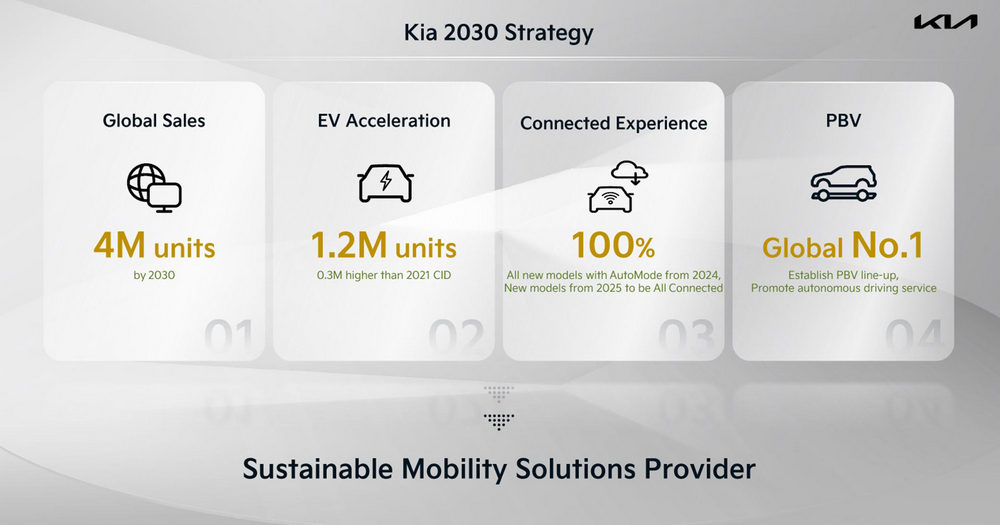 Kia je objavila i svoja četiri ključna poslovna cilja za 2030. godinu. Isti uključuju: brži tempo elektrifikacije i dostizanje godišnje prodaje od 1,2 miliona primeraka baterijskih električnih vozila (BEV) do 2030. godine; dostići 4 miliona prodatih vozila godišnje do 2030., uključujući i više od dva miliona ekološki prihvatljivijih modela; širu upotrebu automobilskih funkcija povezivosti i tehnologije autonomne vožnje na sva nova vozila; te do 2030. godine postati brend broj jedan na svetskom tržištu namenskih vozila (PBV).