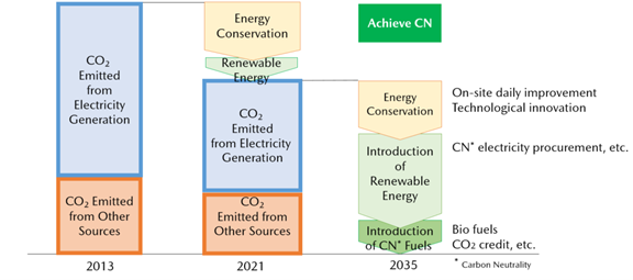 Kako bi postigla ugljeničnu neutralnost u Mazdinim fabrikama širom sveta do 2035., Mazda će nastaviti da blisko sarađuje sa svojim partnerima i fokusirana je na tri oblasti: (1) očuvanje energije, (2) prelazak na obnovljive izvore energije, (3) uvođenje ugljenično neutralnog goriva za interni prevoz.