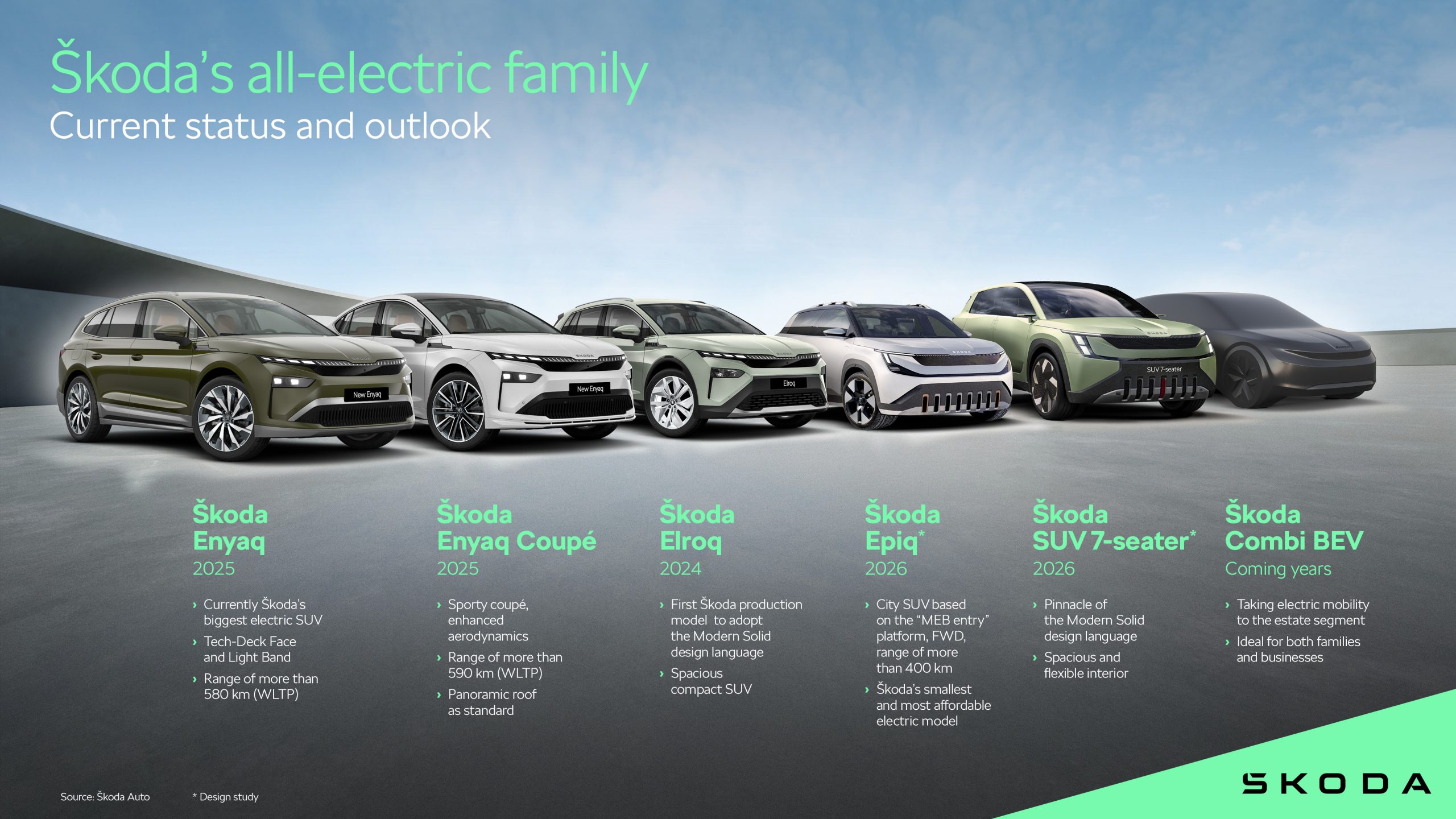 Škoda Auto unapređuje svoju strategiju elektrifikacije uvođenjem nove Enyaq porodice, ažurirajući jednu od najuspešnijih serija potpuno električnih modela u Evropi. Naime, i Škoda Enyaq i Škoda Enyaq Coupé sada imaju novi dizajnerski pravac brenda Modern Solid, naglašavajući njihovu vizuelnu privlačnost. Ažurirani Enyaq može se pohvaliti proširenim dometom, delom zahvaljujući optimizovanoj aerodinamici, uz održive materijale i opsežnu standardnu opremu. Pored toga, nova Enyaq porodica uvodi poboljšane digitalne mogućnosti i naprednije sisteme pomoći. Dvosmerno punjenje je nova karakteristika koja omogućava bateriji da služi kao dodatna jedinica za skladištenje energije kod kuće. Cene za novi Enyaq počinju od oko 44.000 evra.