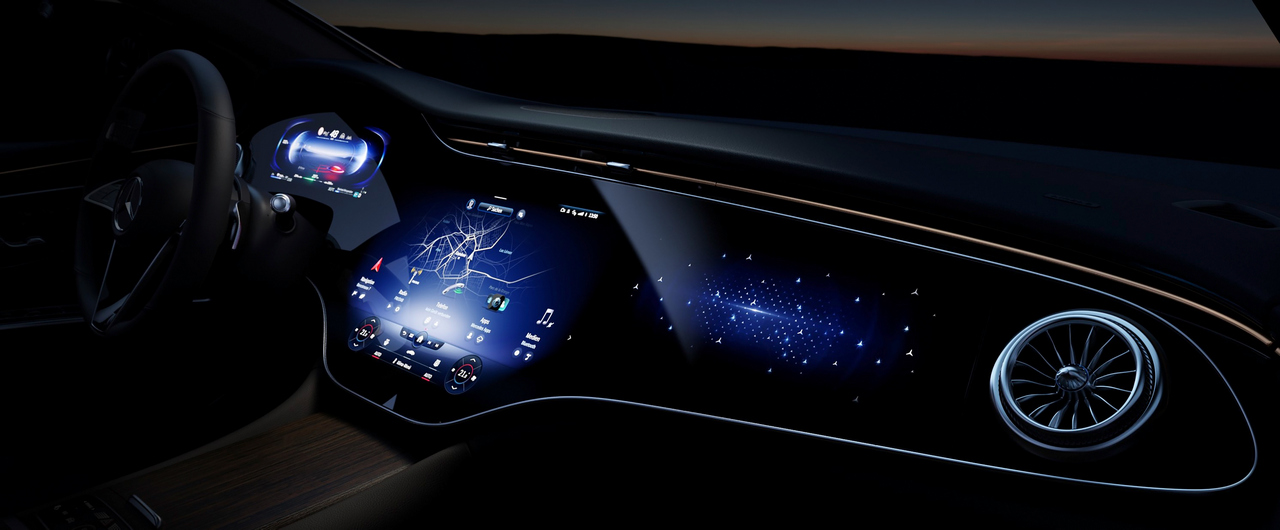 Sa MBUX Hyperscreen-om čini se da se nekoliko ekrana neprimetno spaja, što rezultira impresivnom širinom zakrivljenog ekrana širine preko 141 centimetar. Površina koju putnici percipiraju je 2432,11 kvadratnih cm.