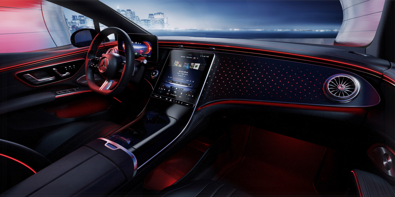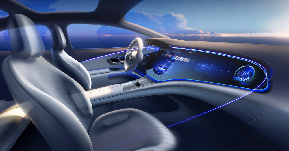Dizajneri su imali misiju i priliku da kroče potpuno novim putem u oblikovanju enterijera. Iskoristili su ovu slobodu: MBUX Hyperscreen je jedna od novina u novom EQS modelu. Udubljeni ekran pruža se ispred putnika od levog do desnog A-stuba poput okeanskog talasa. Pored same veličine, visokokvalitetni, detaljni dizajn takođe garantuje “wau” efekat. MBUX Hyperscreen intergisan je u instrument tablu na minimalistički način. Okružuju ga samo tanki srebrni, okvir u senci, uska traka ventilacionog otvora i uski kožni okvir. Traka ventilacionog otvora se proteže celom dužinom na vrhu i istovremeno je veoma tanka. Ove ektremne proporcije, zajedno sa staklenim talasom MBUX Hyperscreen-a, stvaraju avangardnu arhitekturu kokpita. Miran i jasan dizajn panela vrata pozajmljuju se iz dizajna enterijera modernih životnih prostora. Avangardni, kao i tradicionalni materijali i boje daju unutrašnjosti posebnu atmosferu. Još jedna vizuelna karaktersitika je head-up displej sa sadržajem proširene stvarnosti.
