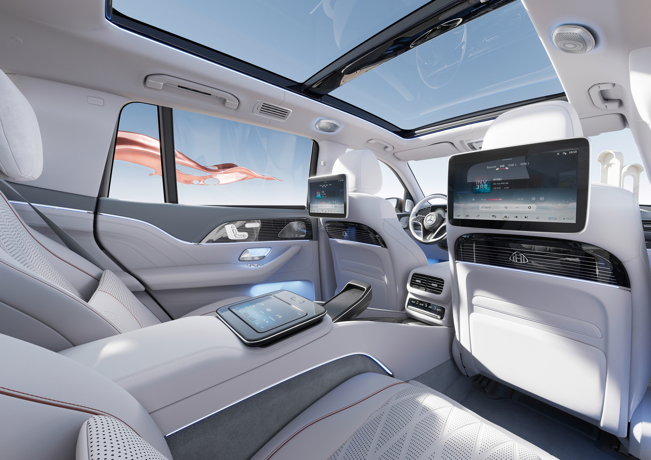 - Sa opcionim MBUX Multi-Seat Entertainment sistemom, putnici na zadnjim sedištima doživljavaju isti sveobuhvatan spektar info-zabavnih i komfornih funkcija kao i oni napred. Imaju upotrebu do tri ekrana osetljivog na dodir i razne intuitivne opcije kontrole kao što je glasovni asistent „Hey Mercedes“.