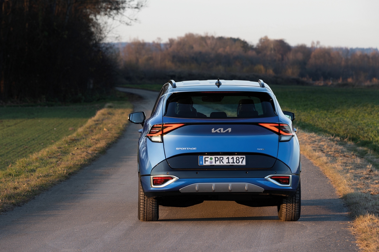 Evropski Sportage otpozadi zadržava svoj snažan izgled na putu sa mišićavim fastback dizajnom koji se preliva u zadnja svetla koja su dizajnirana da ostave utisak da su vrlo precizno urezana u karoseriju. Zadnja svetla povezana su tankom vodoravnom linijom, što novom Sportage-u daje prilično širok izgled otpozadi.