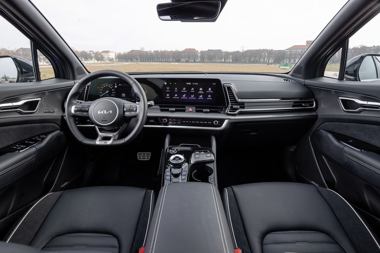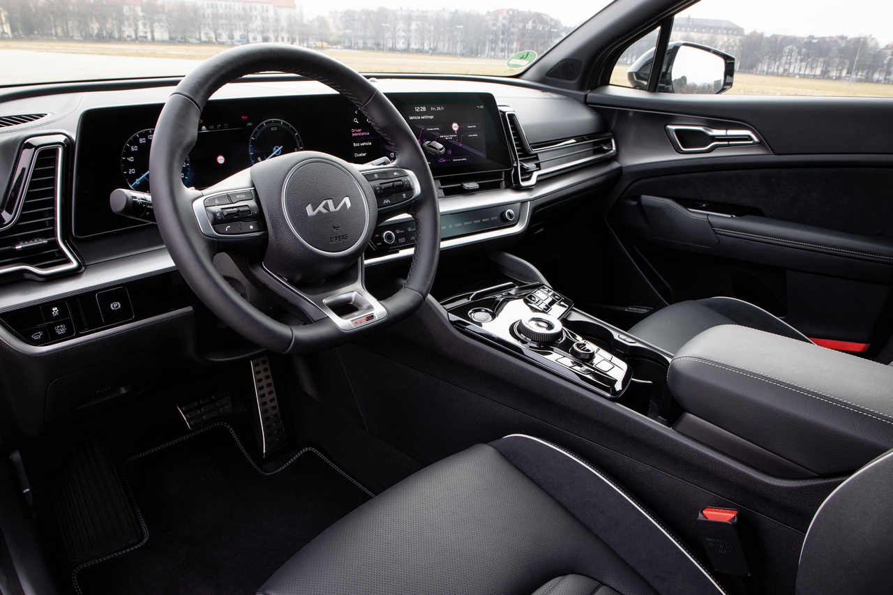 GT-line verzija dodatno naglašava energičnu prirodu Sportage-a, sa elementima enterijera koji stvaraju vizuelno jake kontraste između crne i bele, dajući modelu živopisan i sportski izgled.