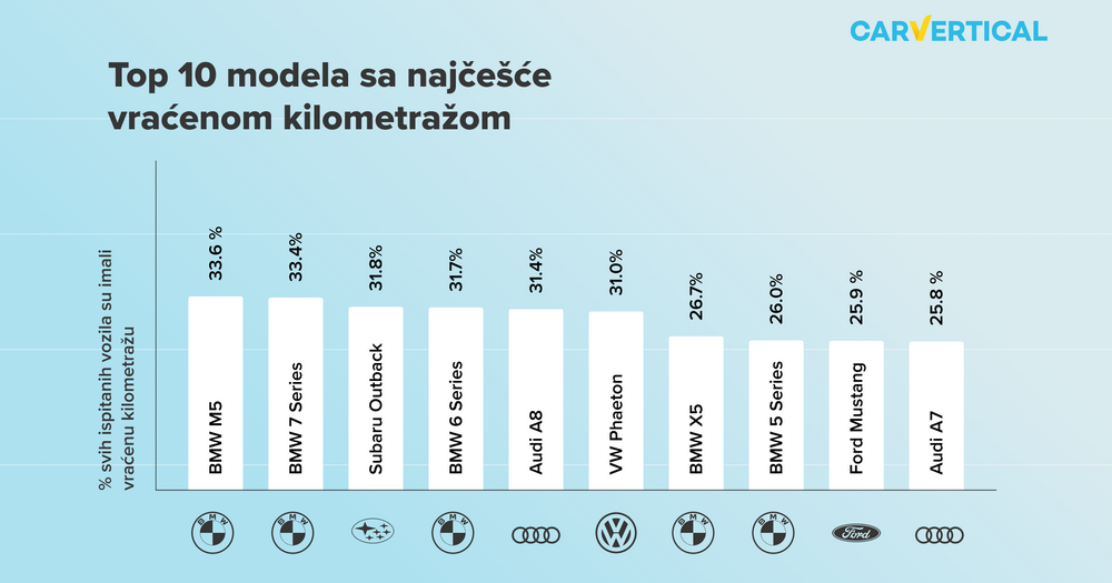 Kao što podaci o kilometraži pokazuju, BMV M5 je najčešće kompromitovan, sa nešto više od jedne trećine proverenih modela kojima je možda kilometraža vraćena. Međutim, ova jedinstvena statistika potcenjuje skalu problema vraćanja brojača kilometara unazad za BMV automobile – kako je gospodin Matas Buzelis, stručnjak za automobile u carVertical-u, nedavno istakao, BMV automobili dominiraju na listi: