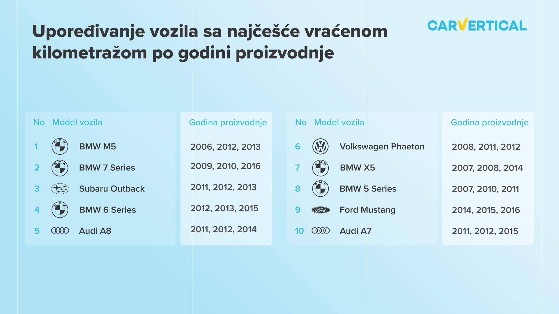 „Lista automobila sa najčešće vraćenom kilometražom sastoji se uglavnom od premium vozila, ali ima i modela ekonomske klase, ali sa manjim učešćem u ukupnom broju modela. Automobili Subaru, Ford i Folksvagen pripadaju istoj starosnoj grupi kao i vozila više klase. Čini se verovatnije da će automobili stari od 5 do 15 godina biti kompromitovani po pitanju broja pređenih kilometara“.