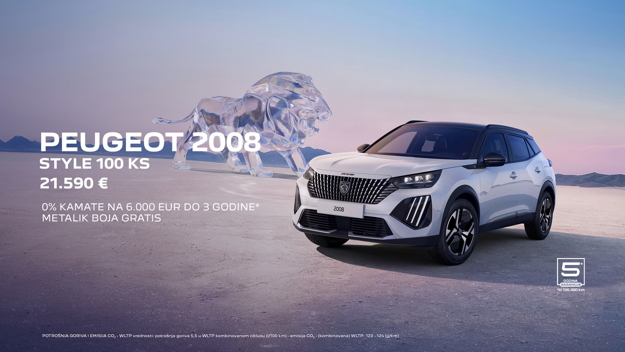Kupcima je na raspolaganju 0% kamate na deo iznosa kredita – 6.000 € za modele 208 i 2008, odnosno 10.000 € za model 3008 – uz rok otplate do 36 meseci. Pored toga, u ponudu je uključena i gratis metalik boja za sve modele, kao i garancija od 5 godina ili 100.000 km, što dodatno potvrđuje sigurnost i pouzdanost Peugeot brenda.