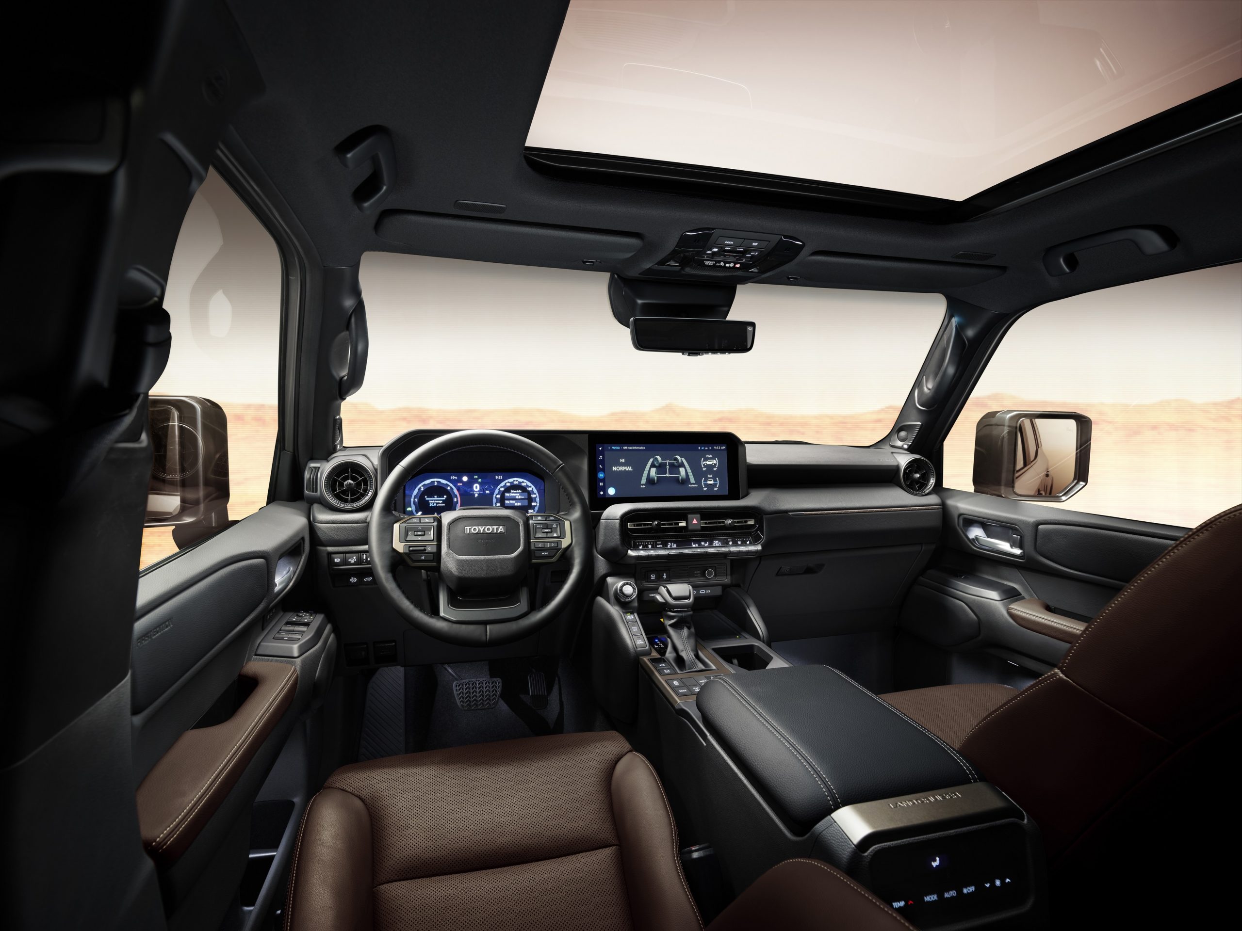 Unutrašnjost nudi izbor između konfiguracija sa pet ili sedam sedišta, s dizajnom koji dočarava snagu i praktičnost istinskog terenca. To naglašavaju i horizontalno postavljena instrument tabla i prekidači koji su oblikovani za lako rukovanje, čak i pri vožnji po zahtevnom terenu.