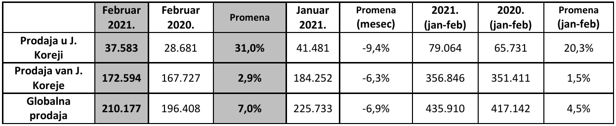 Prodaja u Južnoj Koreji je zabeležila 37.583 vozila, što je 31 posto više nego u februaru 2020. godine. Ovaj izuzetan skok može se pripisati teškoćama u proizvodnji koje je lani prouzrokovala pandemija Covid-19, ali i vrlo dobroj prodaji velikog monovolumena Carnival i limuzine K5.