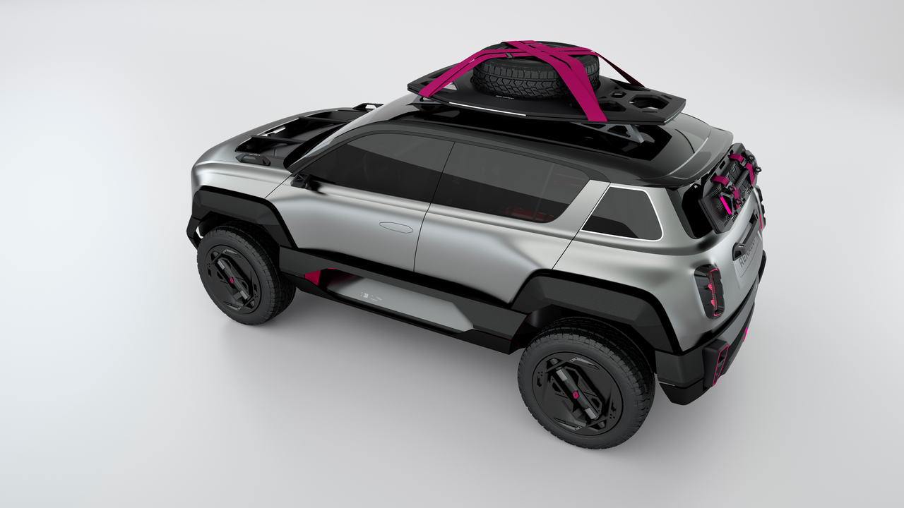 Donji deo karoserije koncepta 4EVER Trophy, obojen u tamnosivu metalik boju, posebno je dizajniran za otvorena prostranstva. Poziva vas da istražite nova prostranstva i snažno odiše avanturističkim duhom. Srebrna karoserija kombinovana sa krovnim držačima prtljaga, amortizerima i amblemima točkova u boji magenta daje mu posebnu čar.