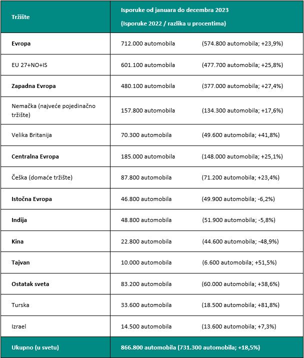 U 2023. godini Škoda Auto je ostvarila značajan porast isporuka vozila, dosegnuvši ukupno 866.800 jedinica. To predstavlja značajan rast od 18,5% u odnosu na prethodnu godinu. Nemačka je i dalje najveće pojedinačno tržište, sa 157.800 isporučenih vozila (+17,6%). Pored toga, Škoda Auto je ostvarila značajan rezultat na domaćem češkom tržištu, s 87.800 isporuka (+23,4%). Najjači rast zabeležen je u Nemačkoj, Velikoj Britaniji i Češkoj. Potpuno električna serija modela Enyaq, koja je među najprodavanijim električnim vozilima na mnogim evropskim tržištima, postavila je novi rekord od lansiranja, s 81.700 prodatih vozila (+52,1%). Štaviše, ulaskom na tržišta Vijetnama i Kazahstana u drugoj polovini 2023. Škoda Auto sistemski unapređuje svoju strategiju internacionalizacije.