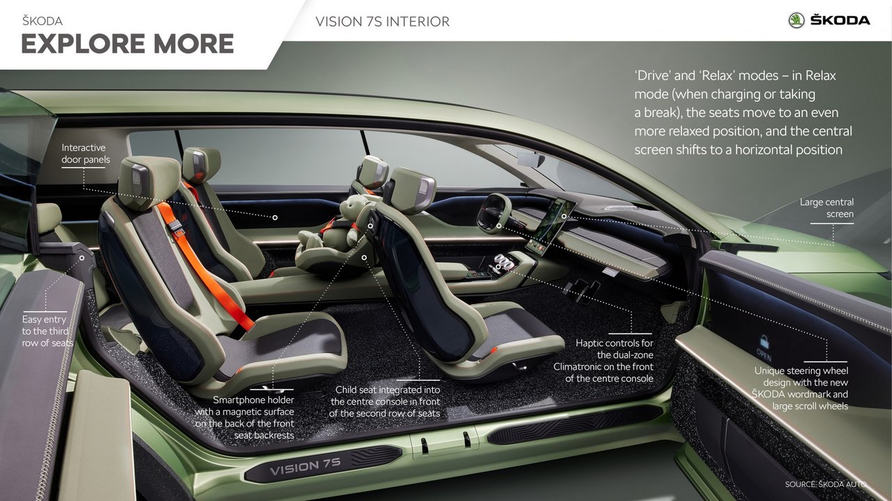 Otkrivajući svoju studiju VISION 7S sa sedam sedišta, ŠKODA AUTO daje prvi specifičan pogled na novi dizajnerski jezik brenda, koji kombinuje robustnost, funkcionalnost i autentičnost. VISION 7S takođe je prva ŠKODA sa mat bojom karoserije. Unutrašnji ambijent karakterišu održivi materijali i interaktivne površine. Koncept automobil može se pohvaliti dometom od preko 600 kilometara u WLTP ciklusu zahvaljujući bateriji od 89 kWh.