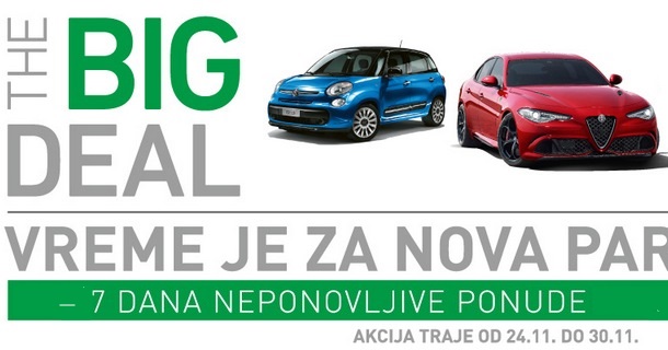 Kampanja pod nazivom ”The Big Deal” specijalno je kreirana prodajna akcija koja se odnosi na sve brendove FCA Grupacije – Fiat, Alfa Romeo, Jeep i Fiat Professional. Ponuda se sastoji od specijalnih kreiranih cena za sve modele gorenavedenih brendova koje će važiti samo tokom trajanja “The Big Deal” kampanje. Ponuda je prevashodno namenjena pravnim licima i promoviše partnerstvo. Sva fizička lica koja su zainteresovana da postanu vlasnici nekog od modela FCA Grupacije takođe očekuju i određene finansijske pogodnosti.