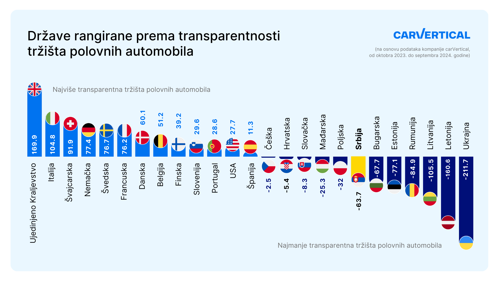 Kompanija za podatke o vozilima carVertical sprovela je godišnju studiju o transparentnosti tržišta kako bi procenila koje su zemlje najrizičnije za kupovinu polovnog vozila. Srbija je ove godine zabeležila pad za jedno mesto, pa se tako sa 18. našla na 19. mestu od 25 zemalja. Susedna Hrvatska je zauzela 15. mesto, Mađarska – 17, a Rumunija – 22.